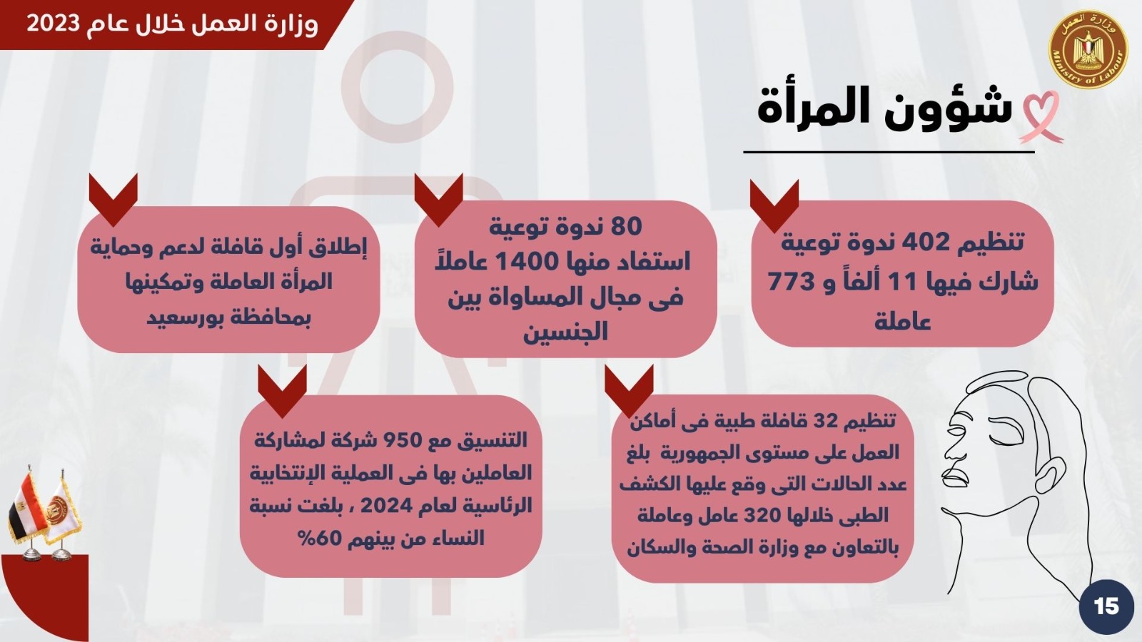 فى ضوء ما توليه وزارة العمل من اهتماماً بالغاً بالمرأة المصرية في ضوء توجيهات القيادة السياسية بأهمية التمكين الاقتصادي للمرأة المصرية، وخلق بيئة عمل محفزة تدعم المساواة بين الجنسين في مجال العمل، والحياة الاقتصادية.