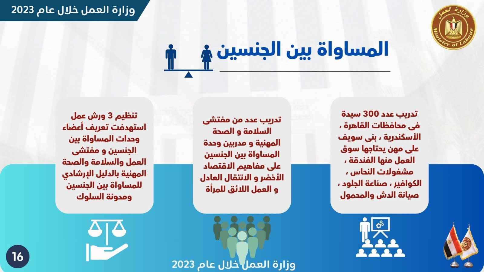 أعلنت وزارة العمل، عن انجازات وحدة المساواة بين الجنسين خلال عام 2023، حيث جرى تدريب عدد 300 سيدة فى محافظات القاهرة، الإسكندرية، بنى سويف، على مهن يحتاجها سوق العمل منها الفندقة، مشغولات النحاس، الكوافير، صناعة الجلود، صيانة الدش والمحمول، و تسليم 25 % من المتدربات المتفوقات أدوات للعمل لبدء مشروعاتهم، وذلك بالتعاون مع هيئة الأمم المتحدة للمرأة، وأيضًا تدريب عدد من مفتشى السلامة والصحة المهنية و مدربين وحدة المساواة بين الجنسين على مفاهيم الاقتصاد الأخضر والانتقال العادل وتأثير التغيرات المناخية على قضايا العمل و العمل اللائق للمرأة بالتعاون مع منظمة العمل الدولية ، بالإضافة إلى تنظيم عدد 3  ورش عمل استهدفت تعريف أعضاء وحدات المساواة بين الجنسين و مفتشى العمل والسلامة والصحة المهنية بالدليل الإرشادي للمساواة بين الجنسين ومدونة السلوك الخاصة بالقضاء على العنف والتحرش في أماكن العمل بالتعاون مع منظمة العمل الدولية ILO .