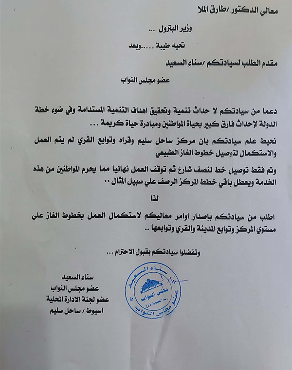 قدمت النائبة سناء السعيد، عضو مجلس النواب، عضو لجنة الإدارة المحلية، بسؤالاً إلى وزير البترول، طارق الملا، تطالبة باستكمال توصيل خط الغاز الطبيعي لمركز ساحل سليم التابع لمحافظة أسيوط، وجميع القرى التابعة للمركز.