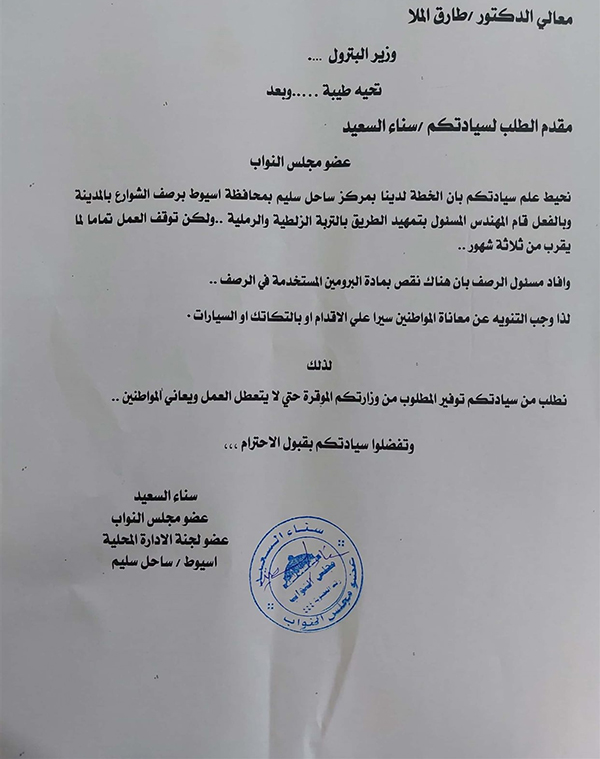 كما طالبت "السعيد" وزير البترول، بضرورة توفير مادة البرومين المستخدمة في رصف الشوارع، وتمهيد الطرق.