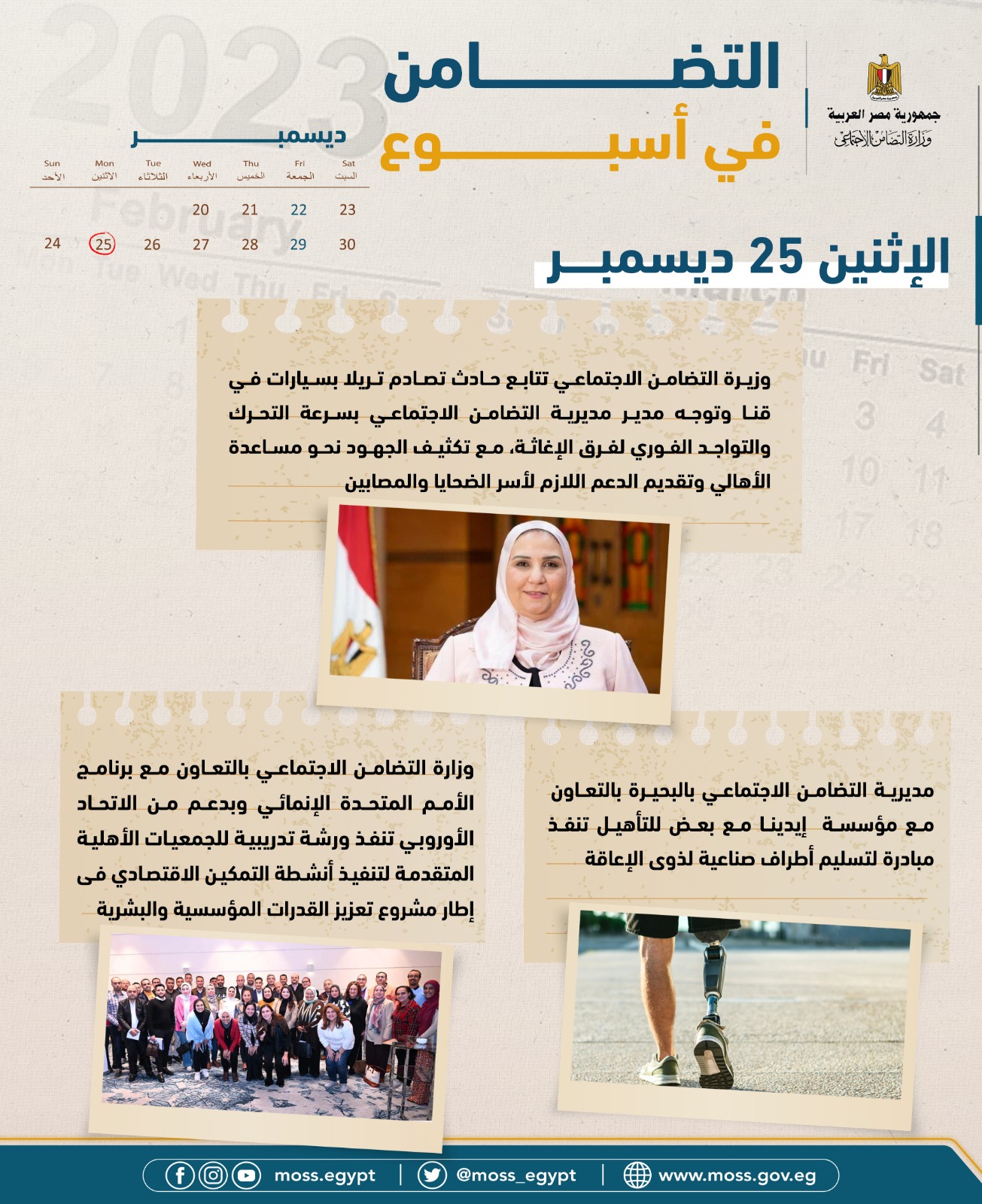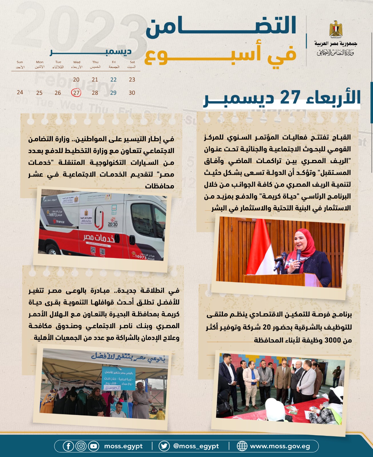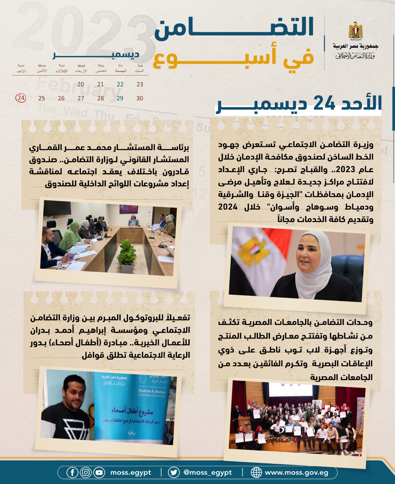 أصدرت وزارة التضامن الاجتماعي تقريرها الأسبوعي بالإنفوجراف والفيديو، حيث تستعرض من خلاله الأنشطة والأحداث، التي قامت بها نيفين القباج وزيرة التضامن الاجتماعي، وكذلك قطاعات الوزارة المختلفة خلال الفترة من 22 ديسمبر إلى 28 ديسمبر 2023 ونستعرض أبرزها في التقرير التالي: