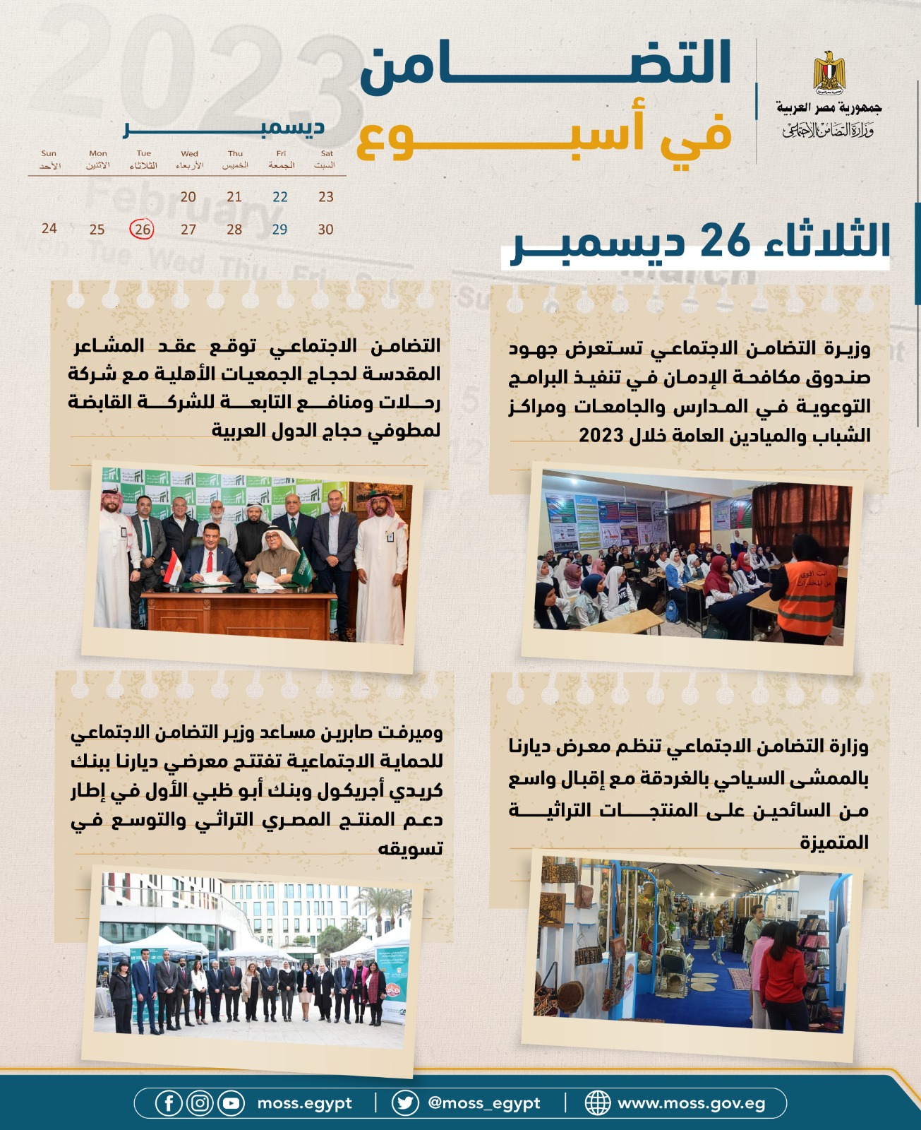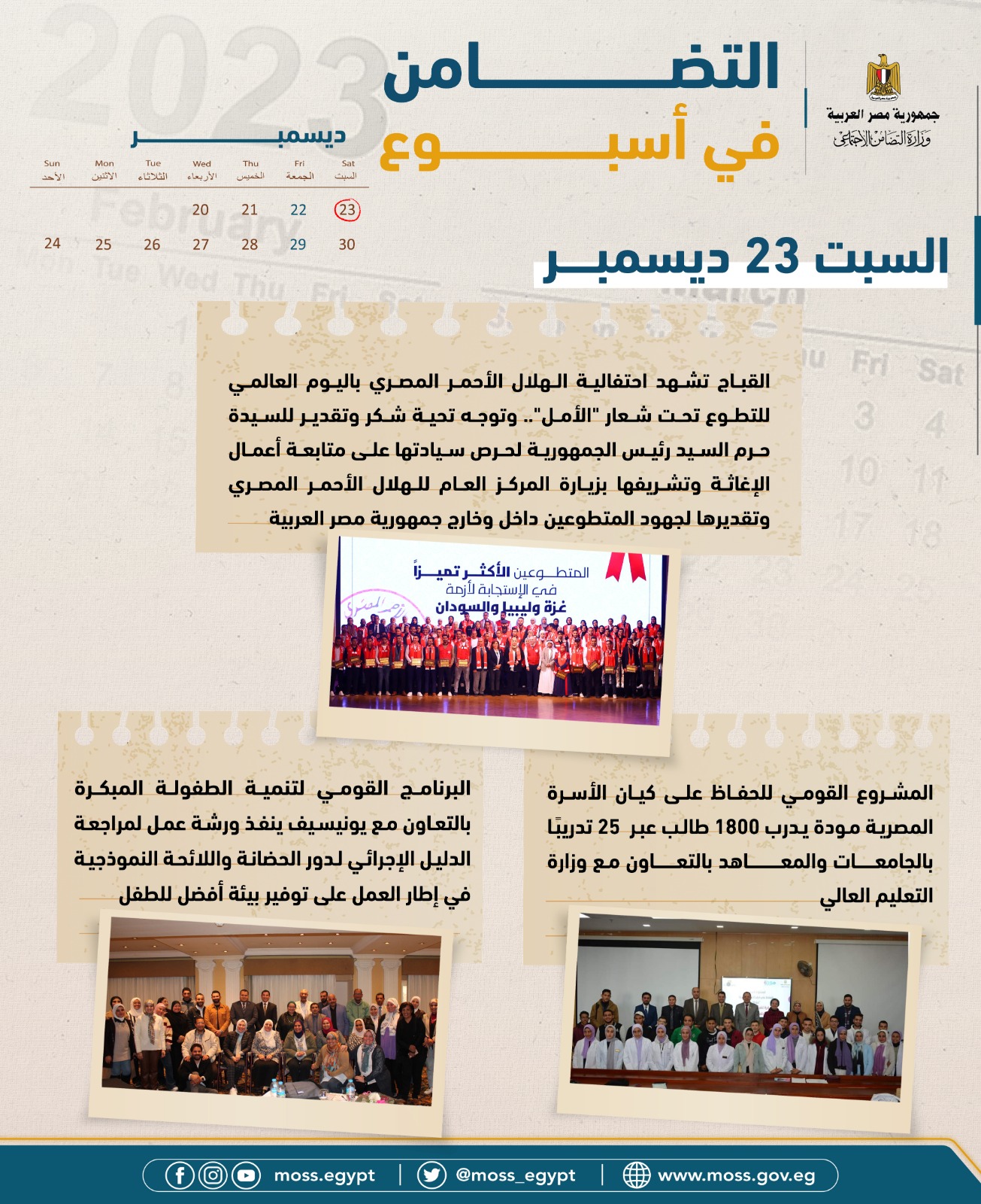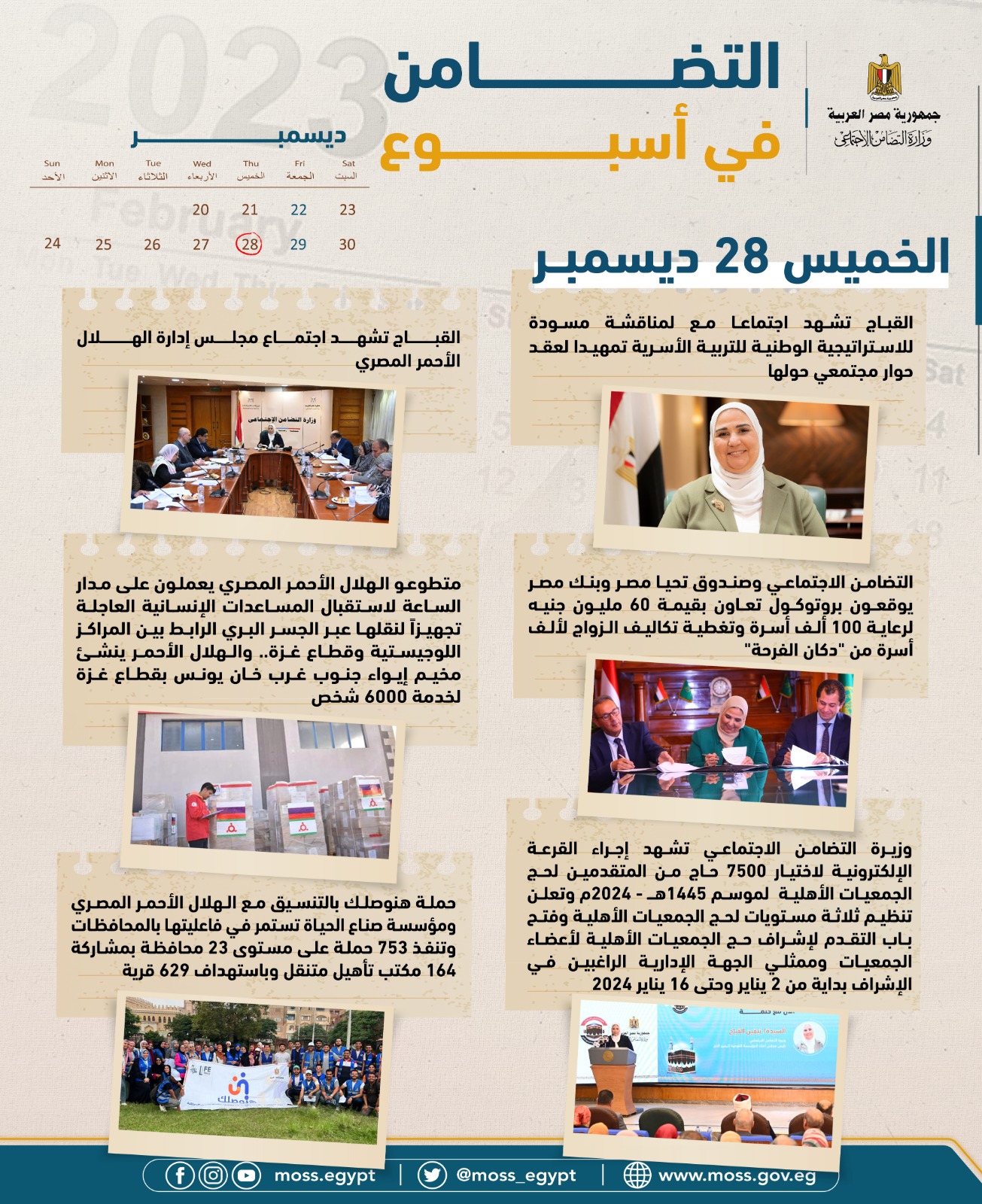 أصدرت وزارة التضامن الاجتماعي تقريرها الأسبوعي بالإنفوجراف والفيديو، حيث تستعرض من خلاله الأنشطة والأحداث، التي قامت بها نيفين القباج وزيرة التضامن الاجتماعي، وكذلك قطاعات الوزارة المختلفة خلال الفترة من 22 ديسمبر إلى 28 ديسمبر 2023 ونستعرض أبرزها في التقرير التالي: