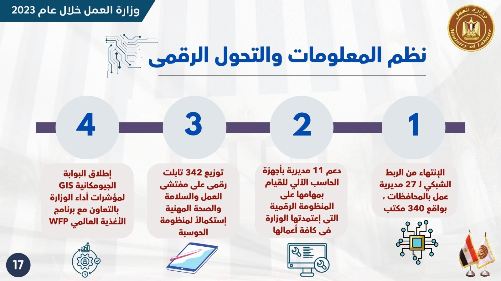 ودعم 11 مديرية بأجهزة الحاسب الآلي للقيام بمهامها على المنظومة الرقمية التي اعتمدتها الوزارة فى كافة أعمالها مع المديريات، بواقع 180 جهاز حاسب آلي و 100 طابعة، وأيضًا توزيع 342 تابلت رقمى على مفتشي العمل والسلامة والصحة المهنية للقيام بمهامهم التفتيشية على المنشآت إستكمالاً لمنظومة الحوسبة التي بدأتها الوزارة فى إطار سعيها نحو التحول الرقمي والجمهورية الجديدة.