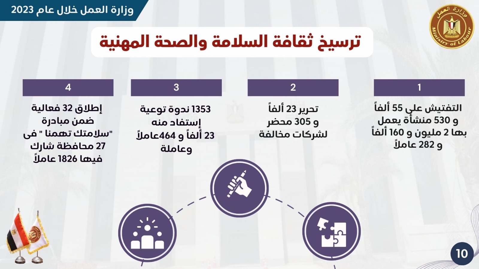 وتم إطلاق 32 فعالية ضمن مبادرة "سلامتك تهمنا" لنشر ثقافة السلامة والصحة المهنية خلال العام في محافظات الجمهورية بعدد لقاءات بلغ 1826 لقاءً شارك فيه 545 منشأة بإجمالى 4735 عاملاً ، كما بلغت عدد ندوات التوعية التي تقوم بها إدارات السلامة والصحة المهنية والمكاتب التابعة فى محافظات الجمهورية للعاملين بالمنشآت ، 1353 ندوة توعية استفاد منها 23 ألفاً و 464 عاملاً ، وجرى منح 4547 ترخيص لمنشآت بعد استيفاء الشروط الواجب توافرها وتأمين المنشآت ، وبحث 11 ألفاً و 30 شكوى فى نفس المجال ، وتنظيم 1298 لجنة تحكيم طبى ، و99 لجنة خماسية ، والتعامل الفورى مع 221 حادث جسيم.