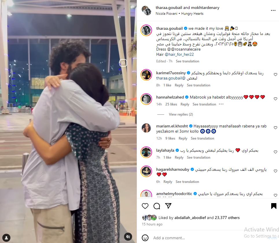 وأكدت ثراء جبيل أنها ستحتفل بزفافها وسط أسرتها وأصدقائها في مصر بعد عودة زوجها من المنحة، حيث علقت على الفيديو قائلةً: "بعد ما مختار جاتله منحة فولبرايت وعشان هيقعد سنتين.. قررننا نتجوز في أمريكا في أجمل وقت في السنة بالنسبة لي.. في الكريسماس 25/12/2023.. وبعدين نفرح وسط حبايبنا في مصر".