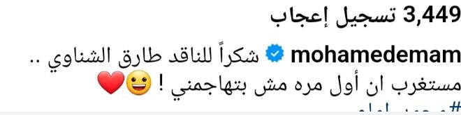 وكتب محمد إمام، عبر حسابه قائلًا : "شكراً للناقد طارق الشناوي.. مستغرب إن أول مرة مش بتهاجمني !".