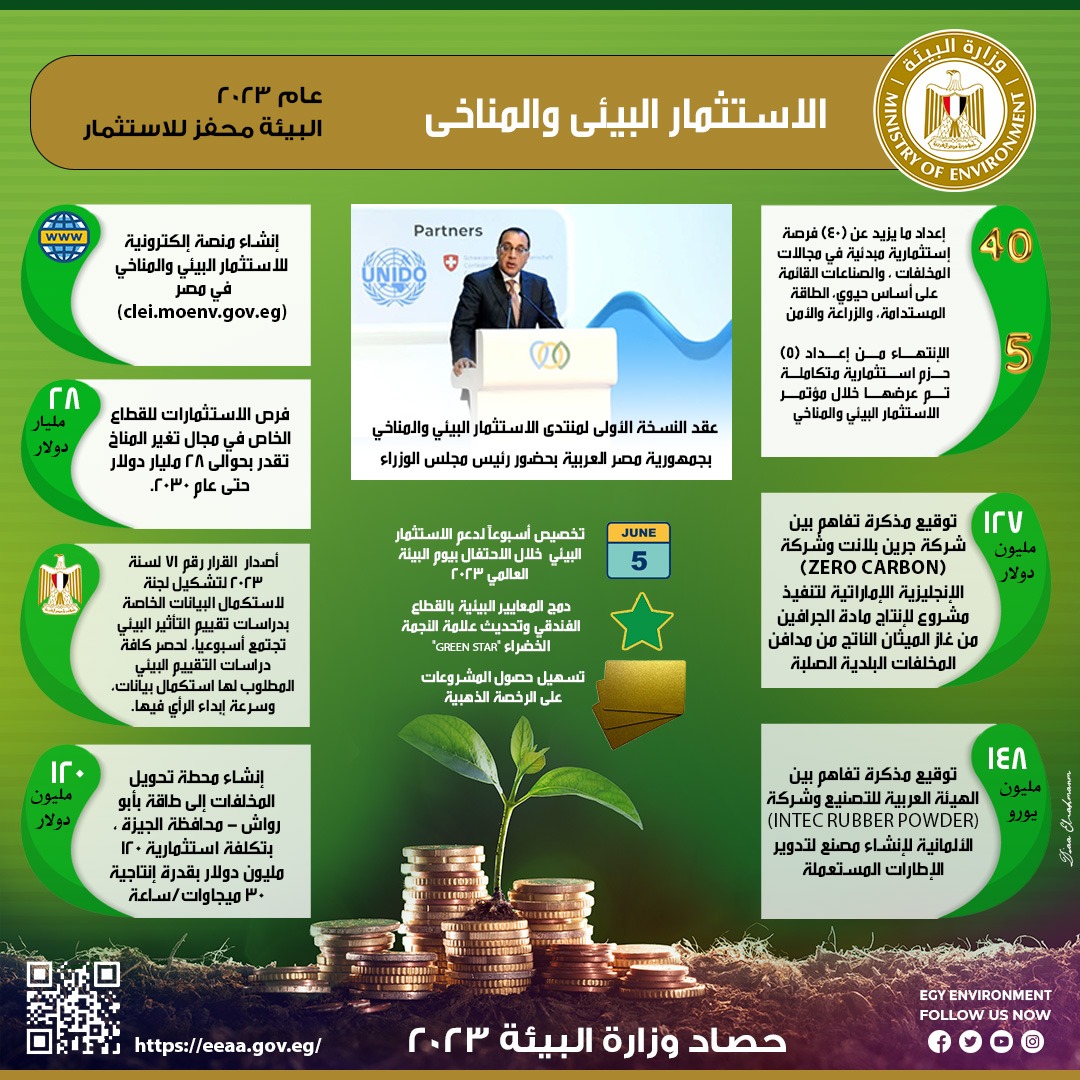 أكدت الدكتورة ياسمين فؤاد وزيرة البيئة أن عام 2023 مثل علامة فارقة في ملف الاستثمار البيئي والمناخي، حيث شهد العام جهود كبيرة من وزارة البيئة لتهيئة المناخ الداعم لتشجيع الاستثمار البيئي والمناخي، حيث خصصت وزارة البيئة أسبوعاً لدعم الاستثمار البيئي  خلال الاحتفال بيوم البيئة العالمي 2023 تحت رعاية رئيس مجلس الوزراء، قامت خلاله الوزيرة  بسلسلة من الزيارات لمشروعات بيئية مختلفة من الإسكندرية وحتى الصعيد، وتم افتتاح العديد من الفعاليات التي تشجع الاستثمار في البشر من خلال تشجيع المشروعات الصغيرة والمبادرات وحملات اشراك المجتمعات المحلية والمجتمع المدني والشباب والمرأة، مثل اطلاق حملة "حكاوي من ناسها" لدعم المجتمعات المحلية بالمحميات الطبيعية.