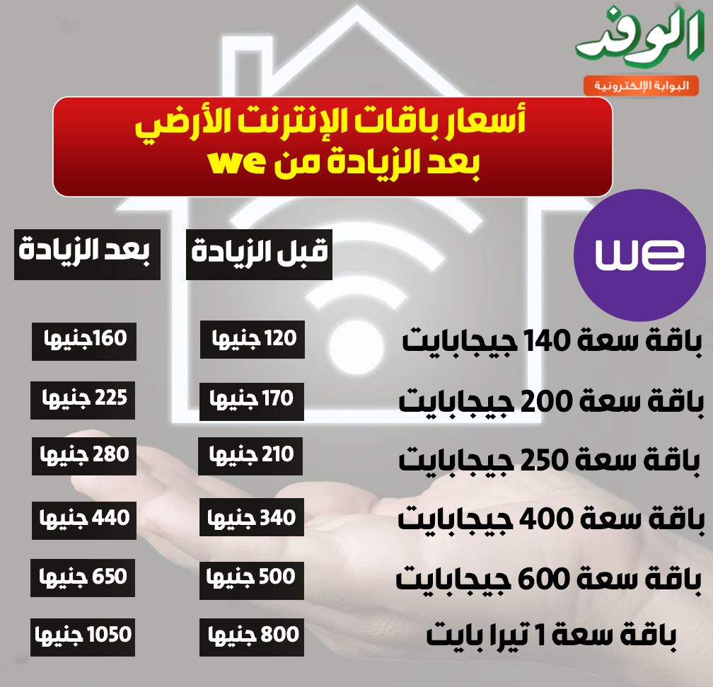 - باقات الإنترنت الأرضي سعة 140 جيجابايت إلى 160 جنيها، لا تشمل الضريبة، بدلا من 120 جنيها.