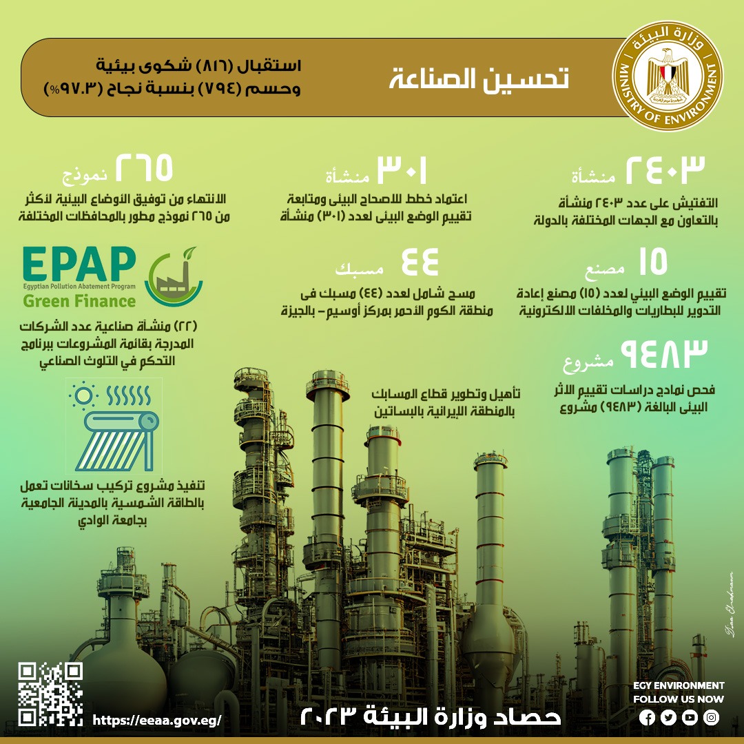 وأضافت وزيرة البيئة أنه فى سبيل ذلك تمكنت وزارة البيئة من الانتهاء من أعمال التفتيش على عدد 2403 منشأة بالتعاون مع عدد من الجهات المختلفة بالدولة، كما تم اعتماد خطط للإصحاح البيئى، ومتابعة تقييم الوضع البيئى لعدد(301) منشأة.