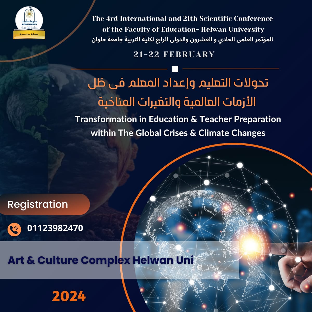 تنظم كلية التربية جامعة حلوان المؤتمر العلمي الـحادي والعشرين والدولي الرابع تحت عنوان: "تحولات التعليم وإعداد المعلم فى ظل الأزمات العالمية والتغيرات المناخية"، خلال الفترة من الفترة 21 إلى 22 فبراير 2024.