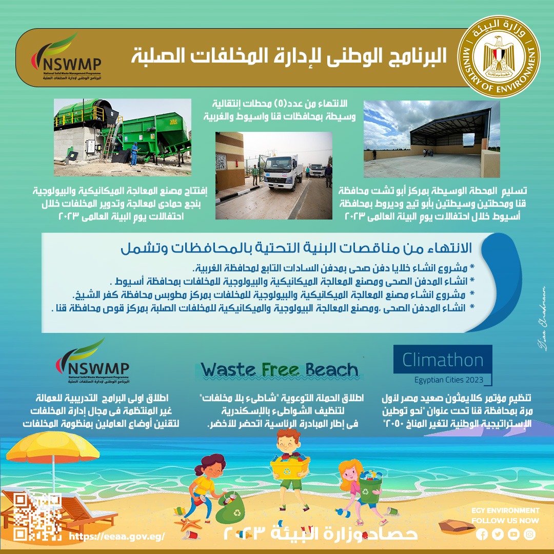 وفي سياق متصل، أكدت وزيرة البيئة أن البرنامج الوطنى لإدارة المخلفات الصلبة التابع للوزارة يعد احد اهم واكبر مشروعات إدارة المخلفات الصلبة فى مصر بتمويل من عدة جهات مانحة دولية ليعمل فى 4 محافظات ( كفر الشيخ / الغربية / قنا / اسيوط )، وقد ساهم في الانتهاء خلال عام 2023 من العديد من مشروعات البنية التحتية للنهوض بالمنظومة فى إطار المبادرة الرئاسية حياة كريمة، حيث تم إنشاء وتسليم 5 محطات إنتقالية وسيطة بمحافظات البرنامج (قنا واسيوط والغربية) وإستكمال العمل بعدد 2 محطة بمركزى منفلوط وابانوب بمحافظة اسيوط، والإنتهاء من طرح المناقصات لمشروعات البنية التحتية بالمحافظات، ومنها مناقصات مشروعات انشاء مدافن صحية وخلايا دفن بقوص والسادات واسيوط، ومشروعات إنشاء مصانع المعالجة البيولوجية والميكانيكية للمخلفات الصلبة بقوص واسيوط ومطوبس محافظة كفر الشيخ، إلى جانب استمرار أعمال التوعية وبناء القدرات، ومنها تنظيم مؤتمر كلايمثون صعيد مصر لأول مرة بمحافظة قنا بمشاركة عشرات من شباب الجامعات بالصعيد لعرض اهم المشروعات والأفكار الإبتكارية الصديقة للبيئة فى إدارة المخلفات وربطها بالتغيرات المناخية، واطلاق الحملة التوعوية "شاطىء بلا مخلفات" لتنظيف الشواطىء بمدينة الإسكندرية.