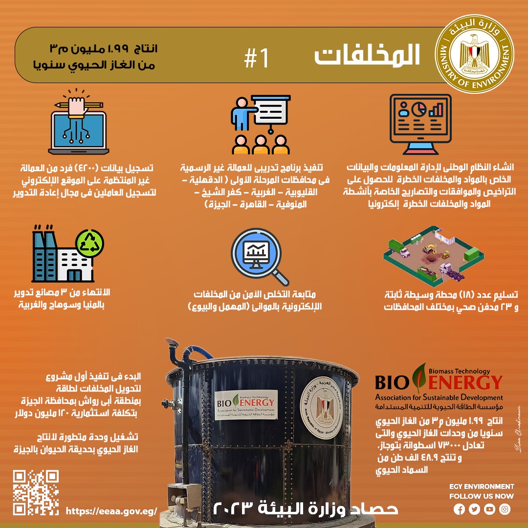 وأشارت وزيرة البيئة إلى استمرار تنفيذ البرنامج الثالث المعني بالدعم المؤسسي والمشاركة المجتمعية، خاصة بعد صدور اول قانون تنظيم إدارة المخلفات رقم 202 لسنة 2020 واللائحة التنفيذية له، حيث شهد عام ٢٠٢٣ بدء تنفيذ أول مشروعات تحويل المخلفات إلى طاقة بمنطقة أبى رواش بمحافظة الجيزة بتكلفة استثمارية ١٢٠ مليون دولار، لانتاج طاقة كهربائية ٣٠ ميجاوات/ساعة، كما واصلت وزارة البيئة جهود دمج القطاع غير الرسمي في مجال المخلفات، مما أدى إلى تسجيل (4200) فرد على مستوى الجمهورية حتى الآن، بياناتهم على الموقع الإلكتروني لتسجيل العاملين فى مجال إعادة تدوير المخلفات، ضمن بروتوكول التعاون بين وزارتي البيئة والتضامن الإجتماعي لتسجيل العمالة غير المنتظمة بالمنظومة رسمياً، وصدر قرار بعدد ٤ مسميات وظيفية للعمل فى مجال ادارة المخلفات، تولت وزارة البيئة اعداد مسودة لها وهم (جمع – فرز – تدوير – تخلص نهائى )، لتقوم مصلحة الأحوال المدنية إضافتها، وأيضا تنفيذ برنامج تدريبى فى محافظات المرحلة الأولى ( الدقهلية - القليوبية - الغربية - كفر الشيخ - المنوفية - القاهرة - الجيزة ) للعاملين غيير الرسميين في المنظومة تمهيدا لمنحهم كارنية مزاولة المهنة لتغيير المسمى الوظيفى فى بطاقة الرقم القومى .