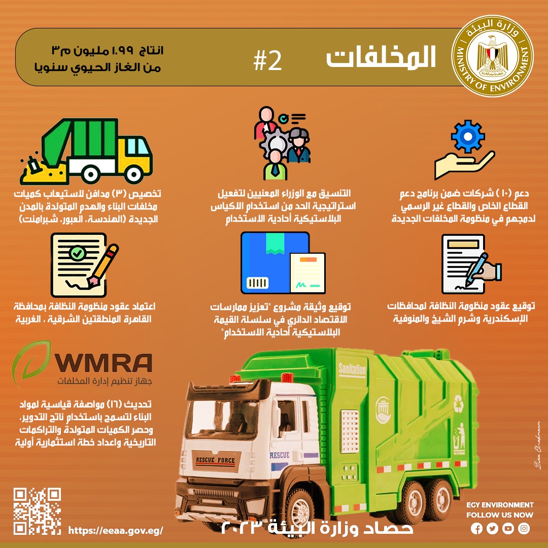 استعرضت الدكتورة ياسمين فؤاد وزيرة البيئة تقريرا حول جهود إدارة المخلفات البلاستيكية الزراعية والخطرة والهدم والبناء خلال عام ٢٠٢٣، وذلك في إطار دور الوزارة التخطيطي والتنظيمي والرقابي في منظومة إدارة المخلفات من خلال جهاز تنظيم إدارة المخلفات، واتخاذ الإجراءات اللازمة لإدارة المخلفات بأنواعها في مصر ضمن منظومة متكاملة بالتعاون مع الوزارات والجهات المختلفة، وتعزيز إشراك القطاع الخاص، وتشجيع الاستثمار في المخلفات.