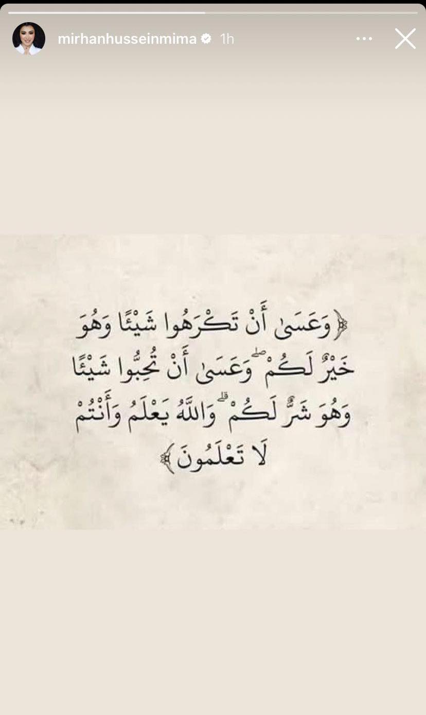 ونشرت ميرهان حسين آية قرآنية تشير إلى أن كل ما يحدث لها فهو خير من عند الله، فقد يكون هناك شيء تكرهه ولكنه يكون خيرًا لك، وقد يكون هناك شيء تحبه ولكنه يكون شرًا لك.