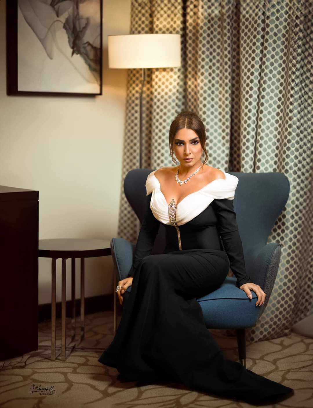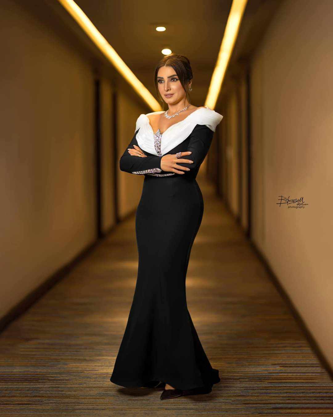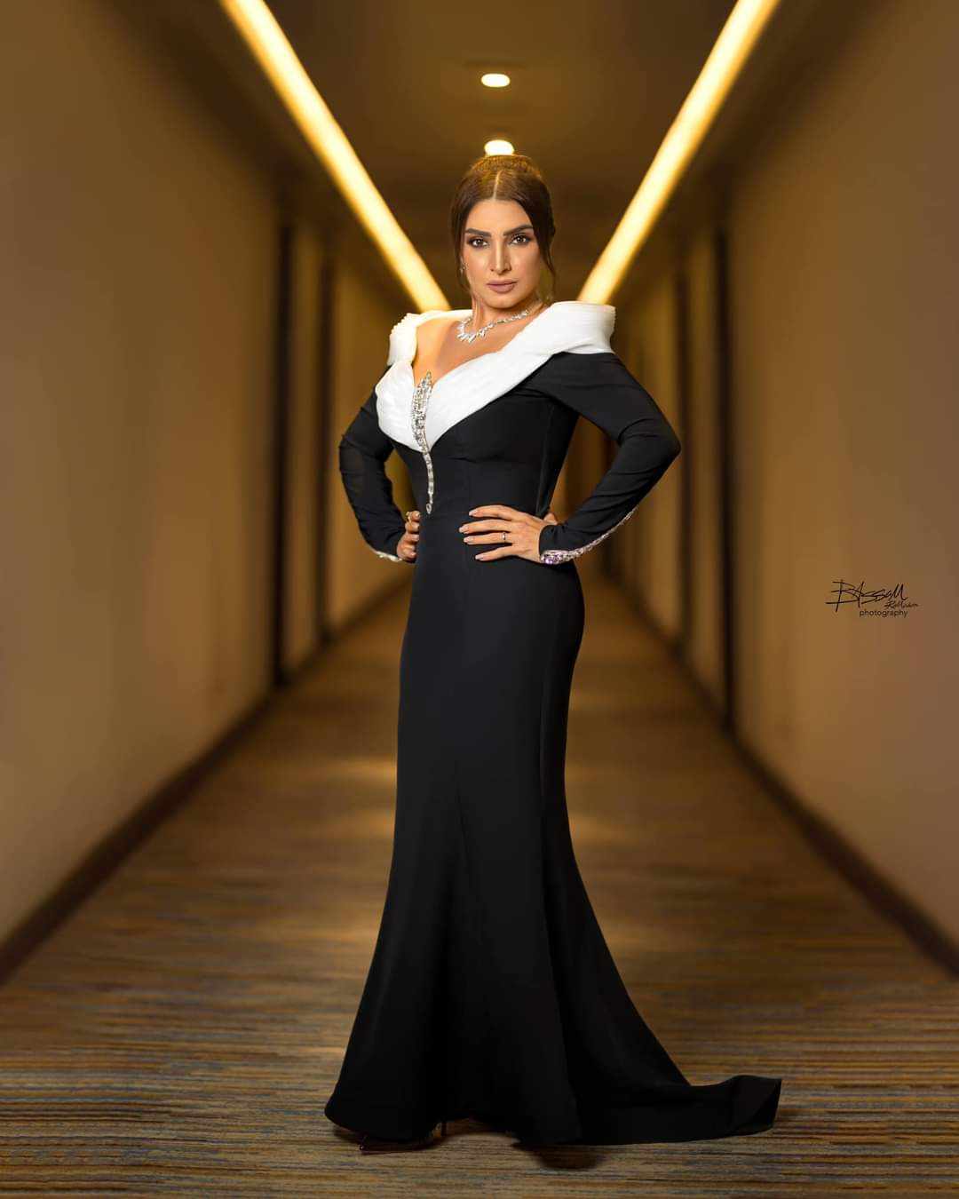 وأضاف ان صمم الفستان من قماش الكريب باللون الأسود مع التل الأبيض حول الصدر، بأكمام طويلة، زين بحبات الألماس الشرافسيكي من الأمام وبلغ ثمنه ألفين دولار بما يعادل ٨٠ ألف بالجنيه المصري.
