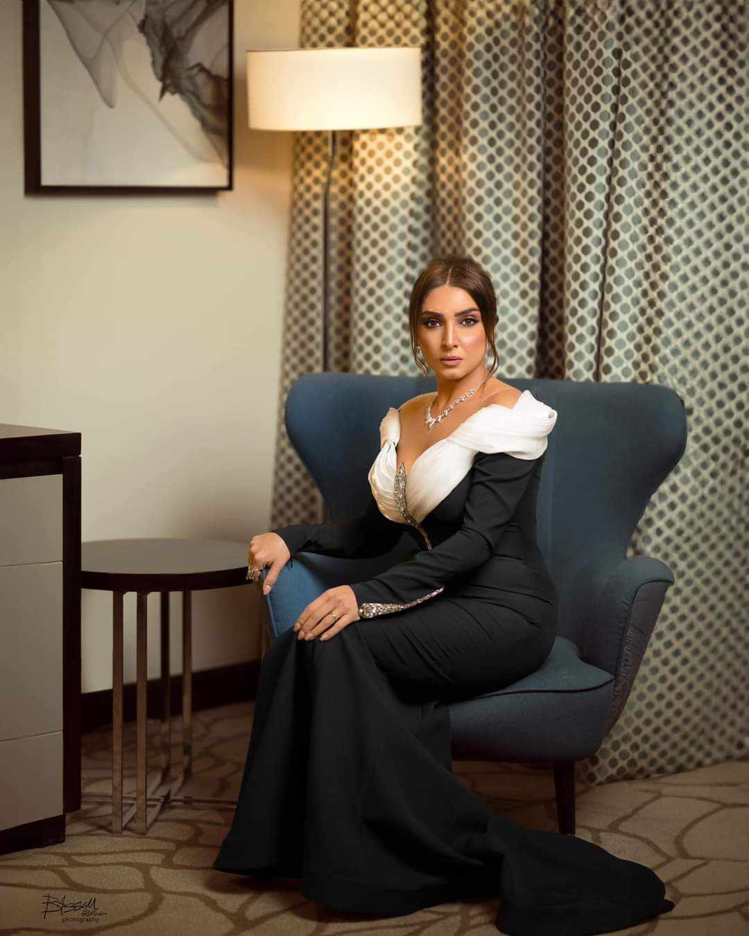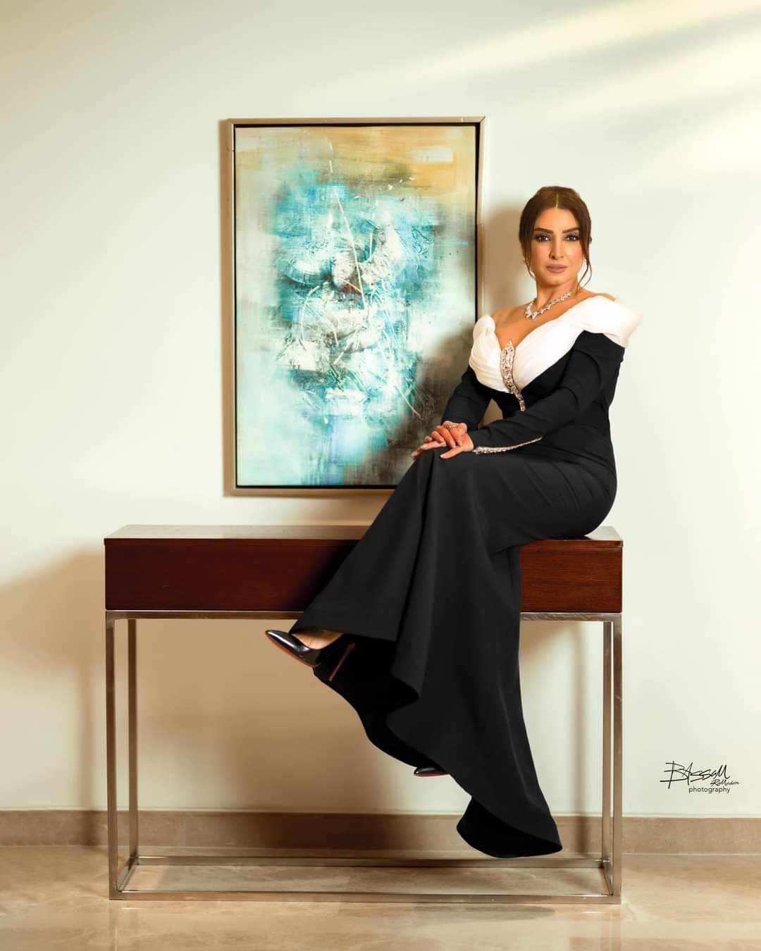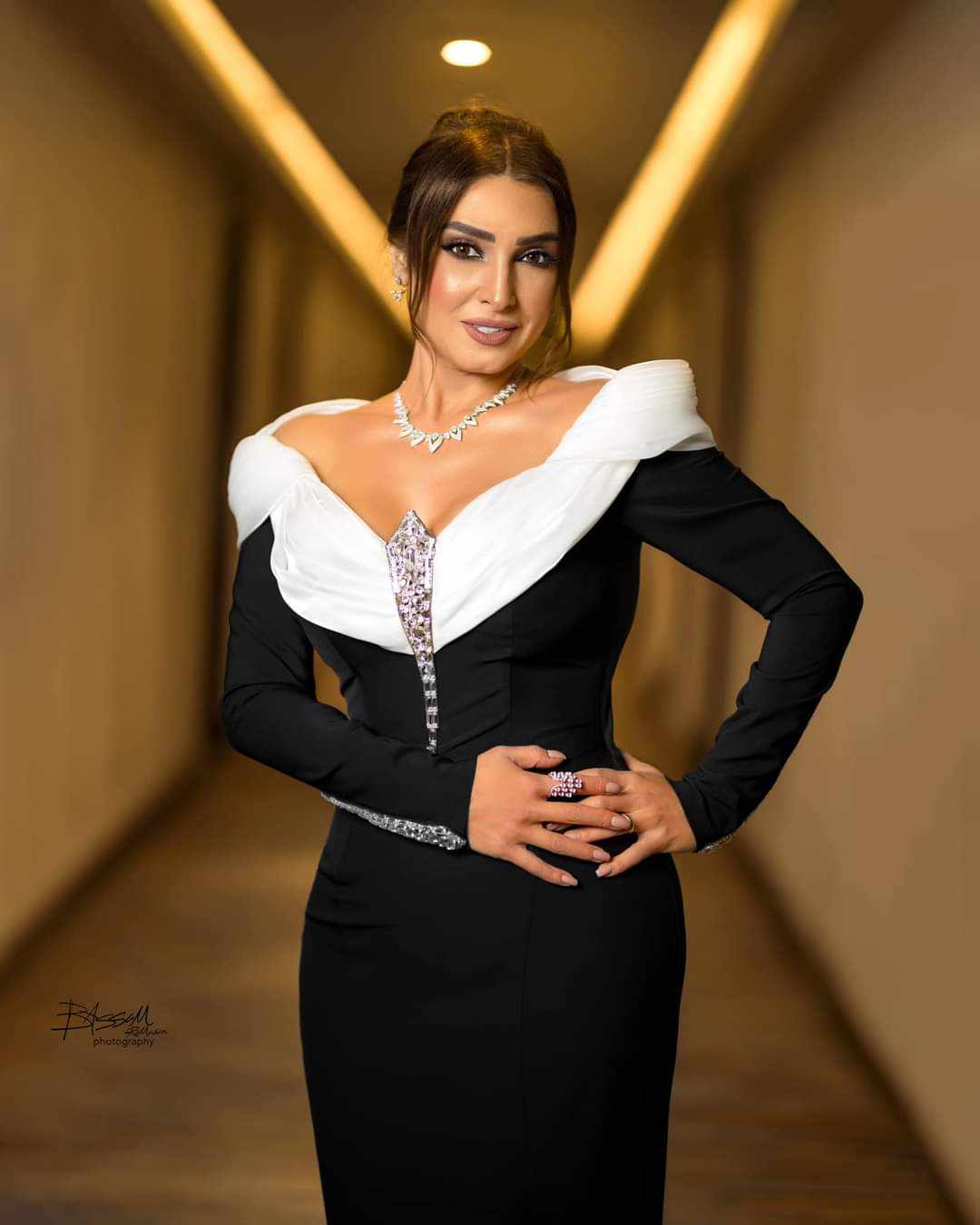 وأضاف ان صمم الفستان من قماش الكريب باللون الأسود مع التل الأبيض حول الصدر، بأكمام طويلة، زين بحبات الألماس الشرافسيكي من الأمام وبلغ ثمنه ألفين دولار بما يعادل ٨٠ ألف بالجنيه المصري.