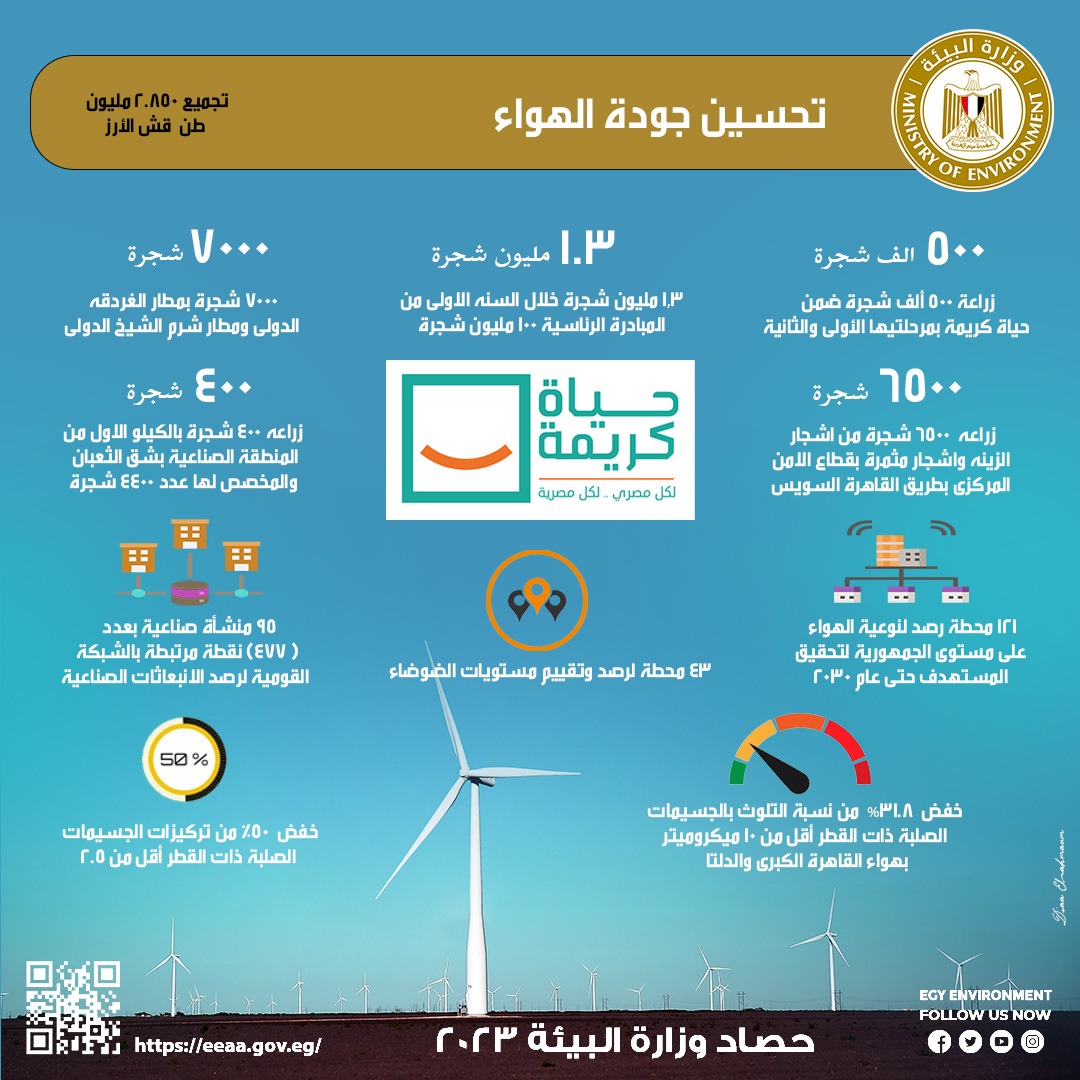 كما أكدت على بذل قصارى الجهود لمضاعفة نصيب الفرد من المساحات الخضراء على مستوى الجمهورية، وتحسين نوعية الهواء وخفض غازات الاحتباس الحراري، وتحقيق الاستفادة الاقتصادية القصوى من الأشجار، حيث شهد عام ٢٠٢٣، الانتهاء من مشروع تشجير قرى الريف المصرى (حياه كريمة بمرحلتيها الأولى والثانية، حيث تم زراعه 500 ألف شجرة بمحافظات الجمهورية، وتنفيذ أعمال رفع كفاءة المشتل المركزى لوزارة البيئة بمرحلتيها الاولى والثانية، وتقديم الدعم بالأشجار للجمعيات الأهلية والمدارس والجامعات والمعاهد والأحياء والمساجد والكنائيس خلال عام 2023 بعدد 100 ألف شجرة، بالإضافة إلى البدء فى أعمال تشجير المنطقة الصناعية بشق الثعبان والمخصص لها عدد 4400 شجرة، حيث تم البدء فى أعمال التشجير فى الكيلو الأول من المنطقة بزراعة 400 شجرة لتحسين نوعية الهواء وخفض الانبعاثات والغبار والأتربة، وتنفيذ أعمال التشجير للمبادرة الرئاسية 100 مليون شجرة، حيث تم خلال عام 2023 تشجير 1,3 مليون شجرة خلال السنة الاولى من المبادرة وتنفيذ الأعمال بنسبة 100%، والمشاركة فى أعمال تشجير قطاع الأمن المركزى بطريق القاهرة السويس، حيث تم زراعة ما لا يقل عن 6500 شجرة من أشجار الزينة وأشجار مثمرة لخدمة القطاع وإظهار المظهر الجمالى والحضارى لقطاع الأمن المركزى، وأيضًا تشجير مطار الغردقه الدولى ومطار شرم الشيخ الدولى بعدد 7000 شجرة (3500 شجرة لكل مطار) لإظهار المطار بالمظهر اللائق والمشرف، وكذلك خفض الانبعاثات.