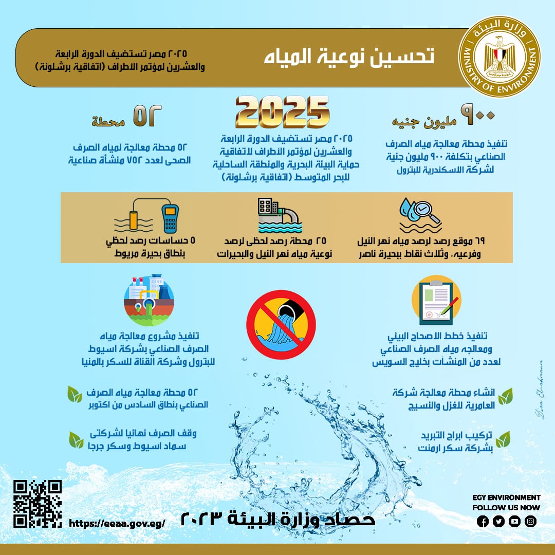 واستعرضت مجهودات التفتيش على المنشآت التي تقوم بالصرف علي المصارف، حيث تم التفتيش علي المنشآت الصناعية التي تقوم بالصرف علي مصرف غرب النوبارية بمحافظة الاسكندرية باجمالي عدد 9 منشآت، وعلى مصرف كتشنر بمحافظة الغربية باجمالي عدد 42 منشآة، ومصرف بحر البقر بمحافظتي الشرقية والقليوبية باجمالي عدد 78 منشآة، وعلي مصرف حادوس بمحافظة الدقهلية والشرقية باجمالي عدد 5 منشآت. كما تم الانتهاء من تنفيذ مشروع معالجة مياه الصرف الصناعي بشركة اسيوط للبترول واعادة استخدام المياه في زراعة الجوجوبا ،والانتهاء من تنفيذ مشروع معالجة مياه الصرف الصناعي بشركة القناة للسكر بمحافظة المنيا ، وتضمنت مجهودات متابعة الموقف البيئي لنهر النيل التفتيش علي المنشآت التي تقوم بالصرف علي نهر النيل (صرف مباشر 9 منشآت – وصرف غير مباشر 12 منشأة) باجمالي عدد 21 منشأة ، والانتهاء من تنفيذ خطط الاصحاح البيئي لشركة سكر ابو قرقاص بتمويل من برنامج التحكم في التلوث الصناعي، والانتهاء من تركيب أبراج التبريد بشركة سكر أرمنت بتمويل من برنامج التحكم في التلوث الصناعي، ووقف الصرف نهائيا لشركة سماد اسيوط ، ووقف الصرف الصناعي بشركة سكر جرجا.