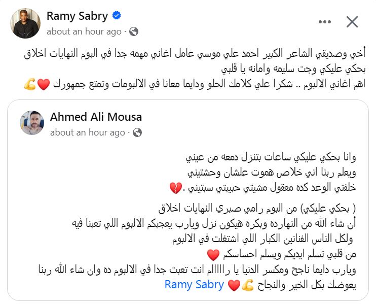 جاء منشور رامي صبري كالآتي "أخي وصديقي الشاعر الكبير احمد علي موسي عامل أغاني مهمة جدا في البوم النهايات أخلاق