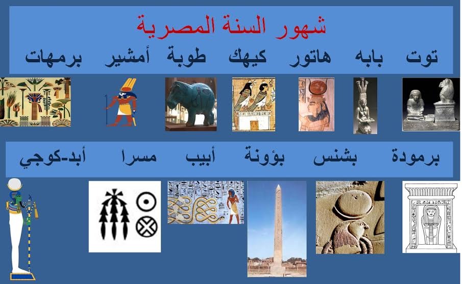 وحتى الآن الشهور فى التقويم القبطى ونحن فى سنة 1740 قبطية نفس الشهور فى مصر القديمة، أول شهر ﺗﻮﺕ هو تحوت إله الحكمة ﻭﻳﺒﺪﺃ ﻣﻦ 11 ﺳﺒﺘﻤﺒﺮثم (ﺑﺎﺑﺔ) ﻭﻳﻘﺎﺑﻠﻪ (ﺣﺎﺑﻰ)، ﻫﺎﺗﻮﺭ - ﺣﺘﺤﻮﺭ، ﻛﻴﻬﻚ- ( ﻛﺎ – ﻫﺎ – ﻛﺎ) العجل أبيس أو سخمت، ﻃﻮﺑﺔ - ﺃﻣﺴﻮ شكل من أشكال آمون رع ، ﺃﻣﺸﻴﺮ - ﻣﻴﺠﻴﺮ، ﺑﺮﻣﻬﺎﺕ- ﻣﻮﻧﺖ إله الحرب، ﺑﺮﻣﻮﺩﺓ- ﺭﻧّﻮ إله الرياح أو الموت، ﺑﺸﻨﺲ- ﺧونسو إله القمر، ﺑﺆﻭﻧﺔ- خنتى أحد أسماء حورس أو إله المعادن، ﺃﺑﻴﺐ - ﺃبيفى وهو الثعبان الكبير الذى أهلكه حورس ، ﻣﺴﺮﻯ - (ﻣﺲ – ﺃﻭ – ﺭﻯ) مخصص لولادة الشمس أو ما يسمى بالانقلاب الصيفي، الشهر الصغير: نسيء وهو خمسة أيام في ثلاث سنوات متتالية والرابعة يكون فيها ستة أيام.
