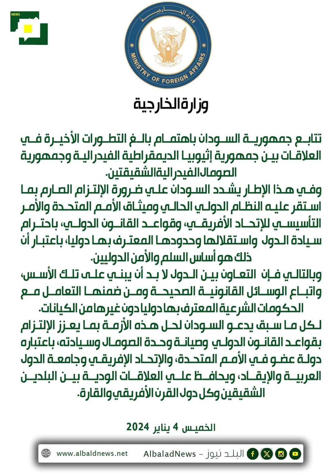 تتابع جمهورية السودان باهتمام بالغ التطورات الأخيرة في العلاقات بين جمهورية إثيوبيا الديمقراطية الفيدرالية وجمهورية الصومال الفيدرالية الشقيقتين.