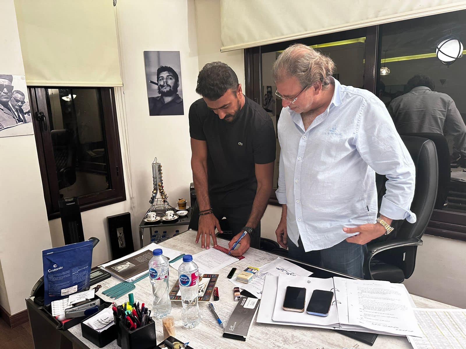ونشر العوضي، مجموعة من الصور عبر حسابه الرسمي بموقع التواصل الإجتماعي “فيسبوك”أثناء توقيعه على العقد ويقف بجواره المخرج خالد يوسف.