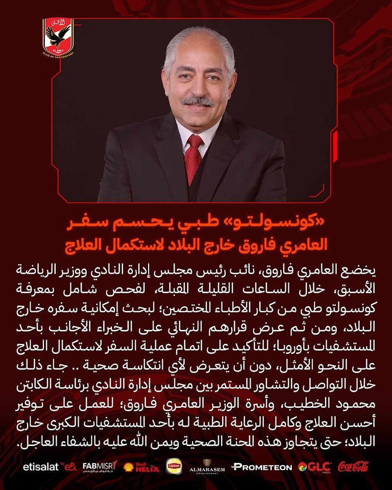 وتواصل مجلس إدارة الأهلي برئاسة محمود الخطيب مع أسرة العامري فاروق وزير الرياضة الأسبق من أجل التنسيق للحصول على أفضل علاج ممكن وأفضل رعاية طبية.