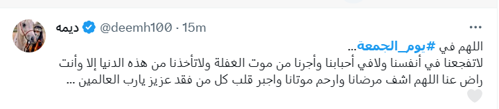 وغرد آخر: "اللهم في يوم الجمعة.. لا تفجعنا في أنفسنا ولا في أحبابنا، وأجرنا من موت الغفلة ولا تأخذنا من هذه الدنيا إلا وأنت راضٍ عنا، اللهم اشف مرضانا وارحم موتانا واجبر قلب كل من فقد عزيزًا يا رب العالمين".
