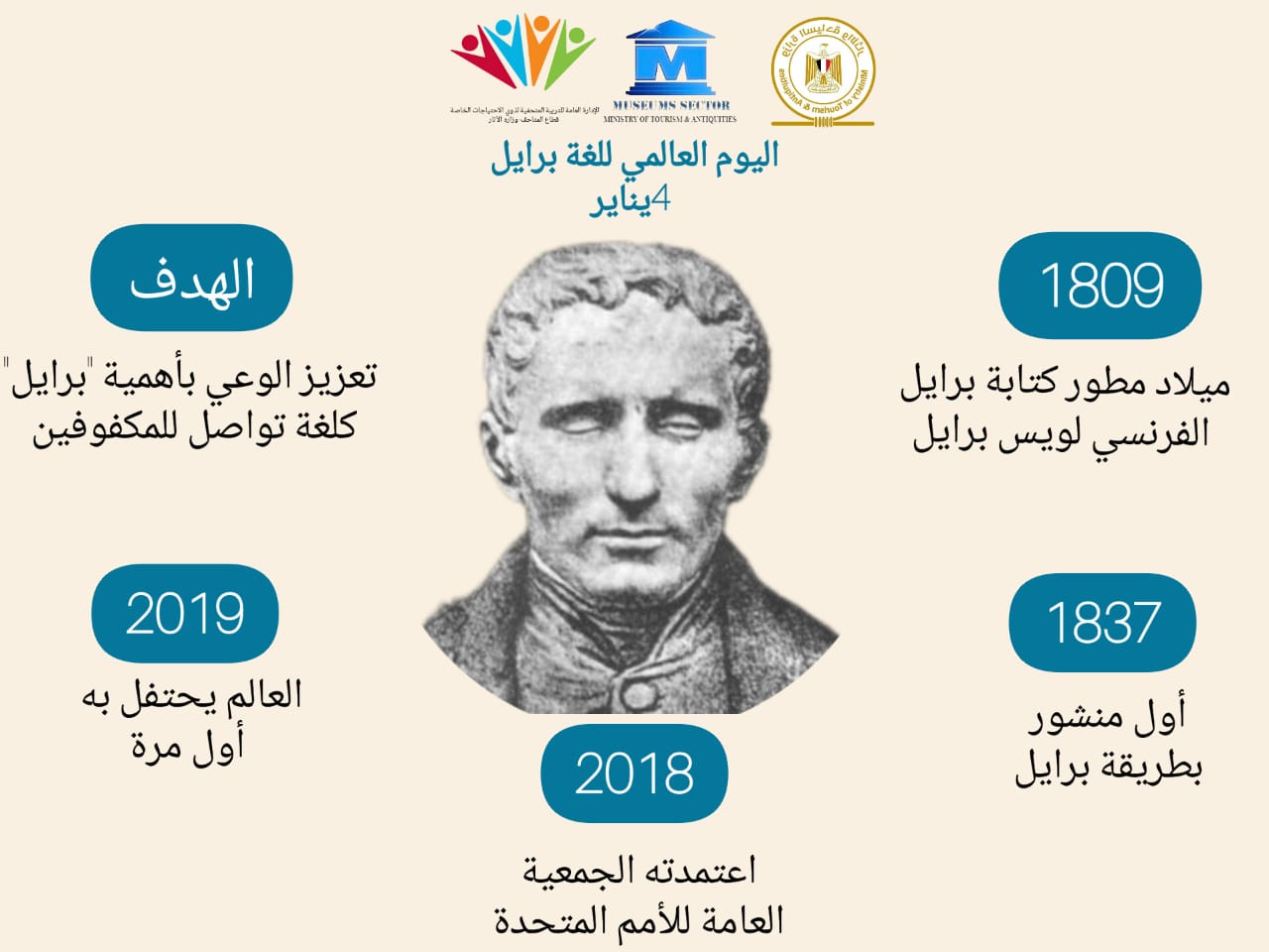 جدير بالذكر أن الجمعية العامة للأمم المتحدة قد أعلنت يوم الجمعة الموافق 4 يناير 2019، يوما عالمياً للغة برايل، والذى يوافق يوم ولادة مؤسس لغة برايل لويس برايل عام 1809م، والتي سميت على اسمه.