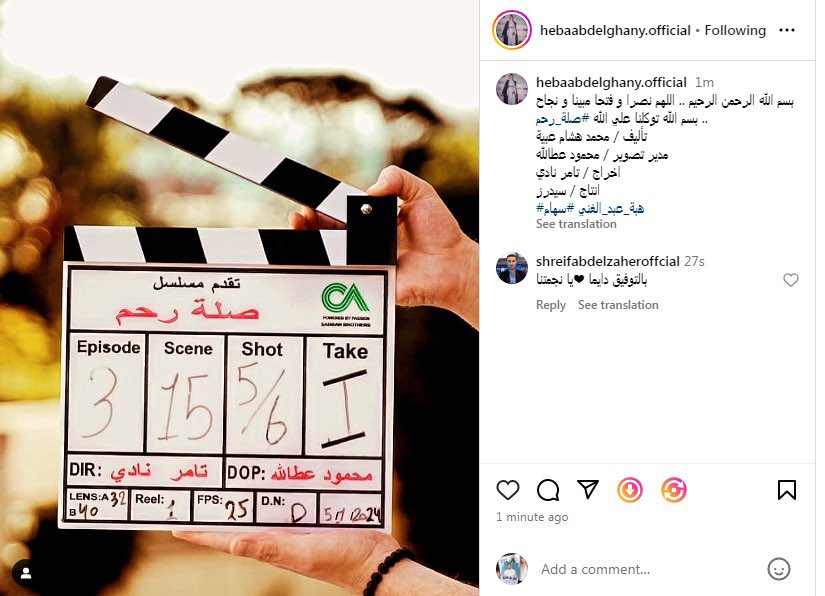 ونشرت صورة كلاكيت تصوير العمل، وعلقت عليها، قائلة :"اللهم نصرا وفتحا مبينا ونجاح.. بسم الله توكلنا على الله صلة رحم ، تأليف محمد هشام عبية، ومدير تصوير محمود عطاالله، اخراج تامر نادي، انتاج سيدرز.. هبة عبد الغني سهام".
