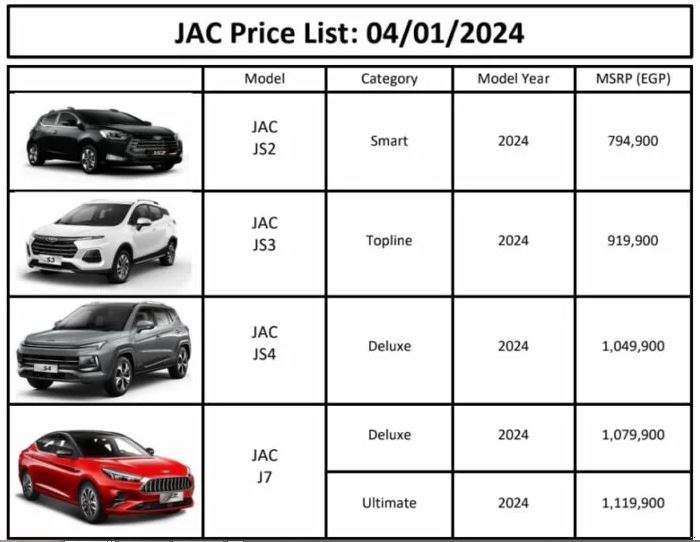 وضمت القائمة الجديدة الصادرة عن المجموعة العربية المتحدة القصراوى جروب، سيارات "جاك s2، جاك js3، js4، j7"، منها سيارة واحدة سيدان وهي السيارة جاك j7 أما باقي السيارات فتنتمي إلى فئة الطرازات الرياضية متعددة الاستخدامات suv.