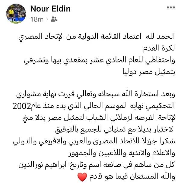 وأعلن إبراهيم نور الدين عبر "فيسبوك"، حيث قال: "الحمد لله اعتماد القائمة الدولية من الاتحاد المصري لكرة القدم".