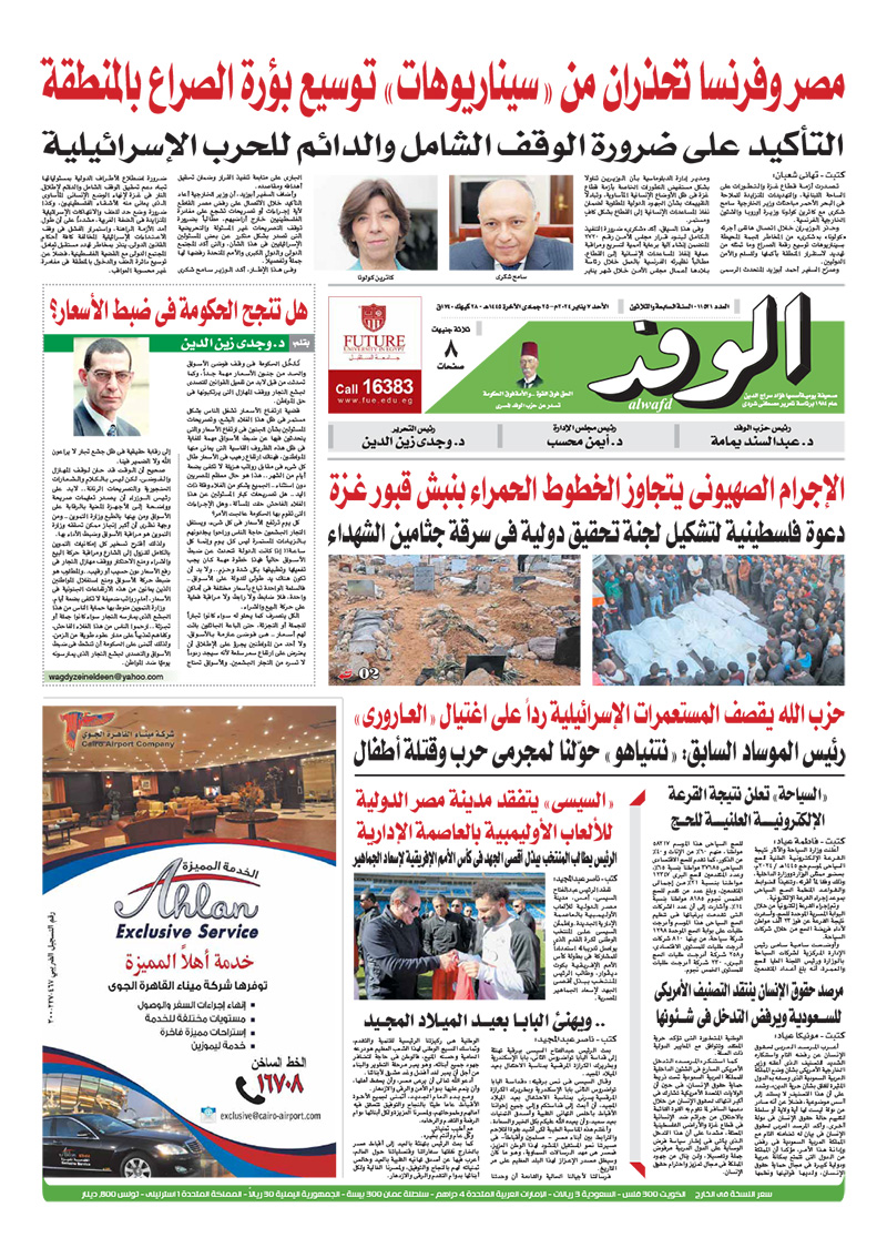 تنشر جريدة الوفد في عددها الصادر، غدًا الأحد، العديد من الموضوعات والتقارير الإخبارية المهمة، أبرزها: “مصر وفرنسا تحذران من ”سيناريوهات" توسيع بؤرة الصراع بالمنطقة".
