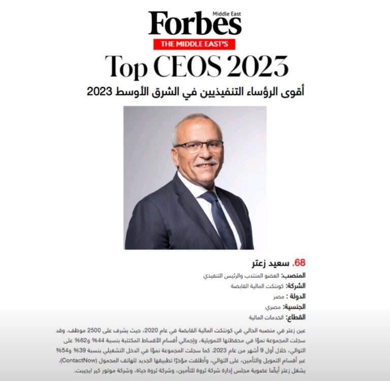 ومن جانبها أعلنت مجموعة " كونتكت المالية القابضة " في بيان لها صدر صباح اليوم عن اختيار سعيد زعتر الرئيس التنفيذي للمجموعة ضمن أقوي الرؤساء التنفيذيين في الشرق الأوسط ٢٠٢٣" من خلال مجلة فوربس الشرق الاوسط وجاء هذا الإختيار لهذه العوامل :