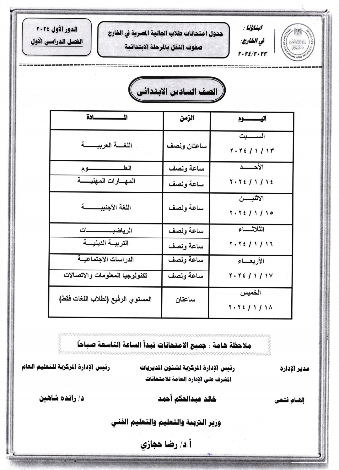 وقررت وزارة التربية والتعليم والتعليم الفني عقد امتحانات أبنائنا في الخارج بدءًا من يوم السبت الموافق 13 يناير 2024.