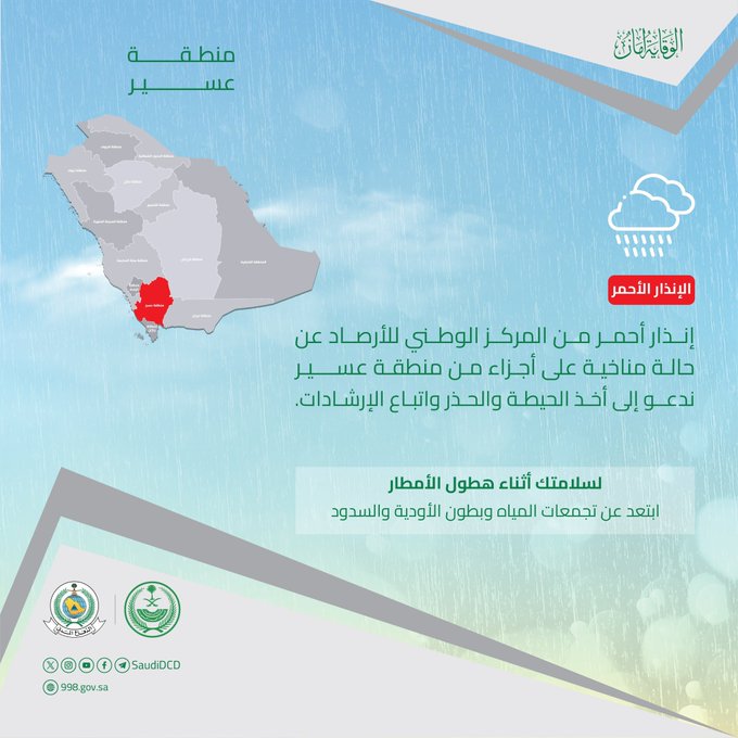من جانبها دعت المديرية العامة للدفاع المدني إلى ضرورة الحيطة ومتابعة الإرشادات بشأن الحالة المناخية في منطقتي "جازان وعسير".