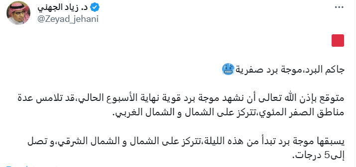 وقال الجهني، عبر حسابه الرسمي بموقع التواصل الاجتماعي "X"، تويتر سابقًا، عن انخفاض درجات الحرارة:"جاكم البرد، موجة برد صفرية، والموجة القوية نهاية الأسبوع الحالي يسبقها موجة برد تبدأ من هذه الليلة، تتركز على الشمال والشمال الشرقي، وتصل إلى 5 درجات".
