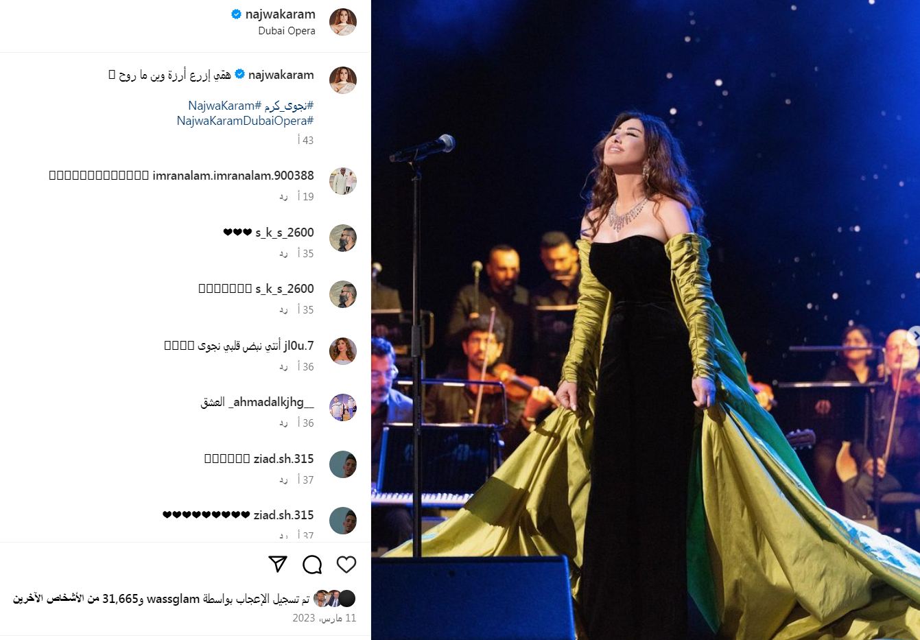 وسبق وخطفت نجوى كرم الأنظار بإطلالتها الأنيقة والجذابة المفعمة بالاحتشام المواكبة لأحدث صيحات الموضة بحفلاتها الغنائية في دار الأوبرا بدبي، حيث ارتدت فستان طويل مجسم، ينتمي لصيحة الكب، صمم من قماش المخمل باللون الأسود ونسقت عليه أكمام منسدلة بشكل لافت صممت من الساتان باللون الليموني، عكس الفستان نعومة ورقي ذوقها.