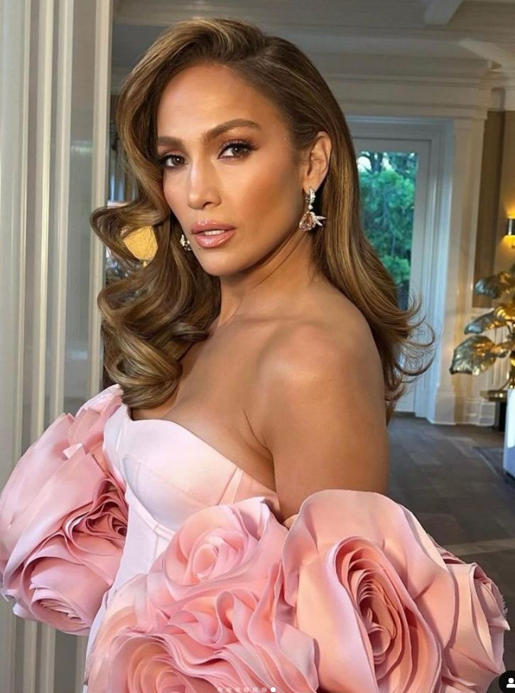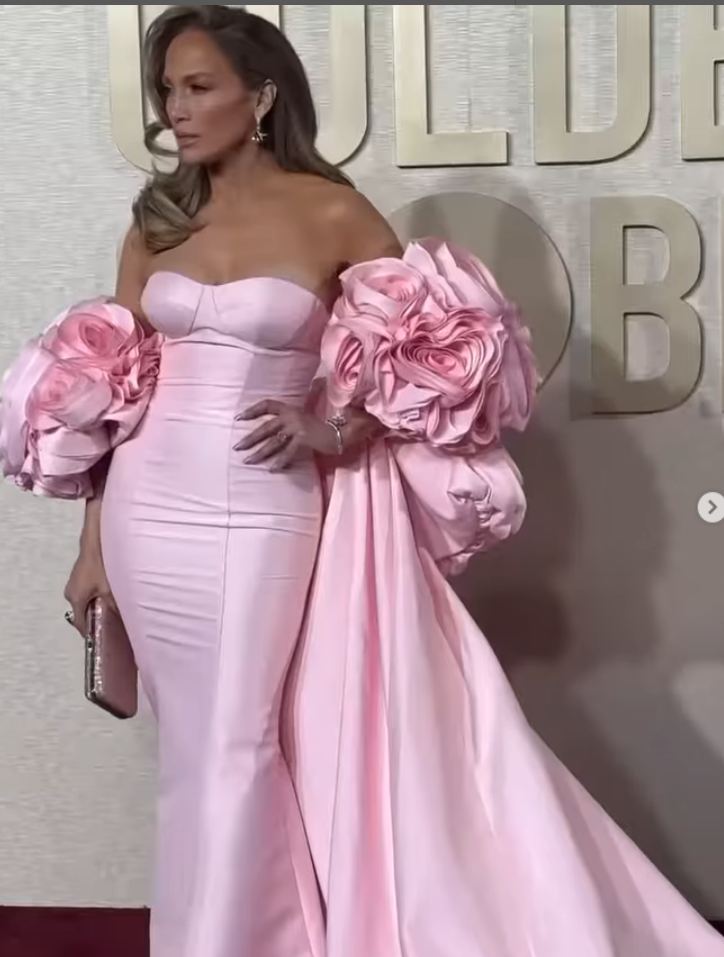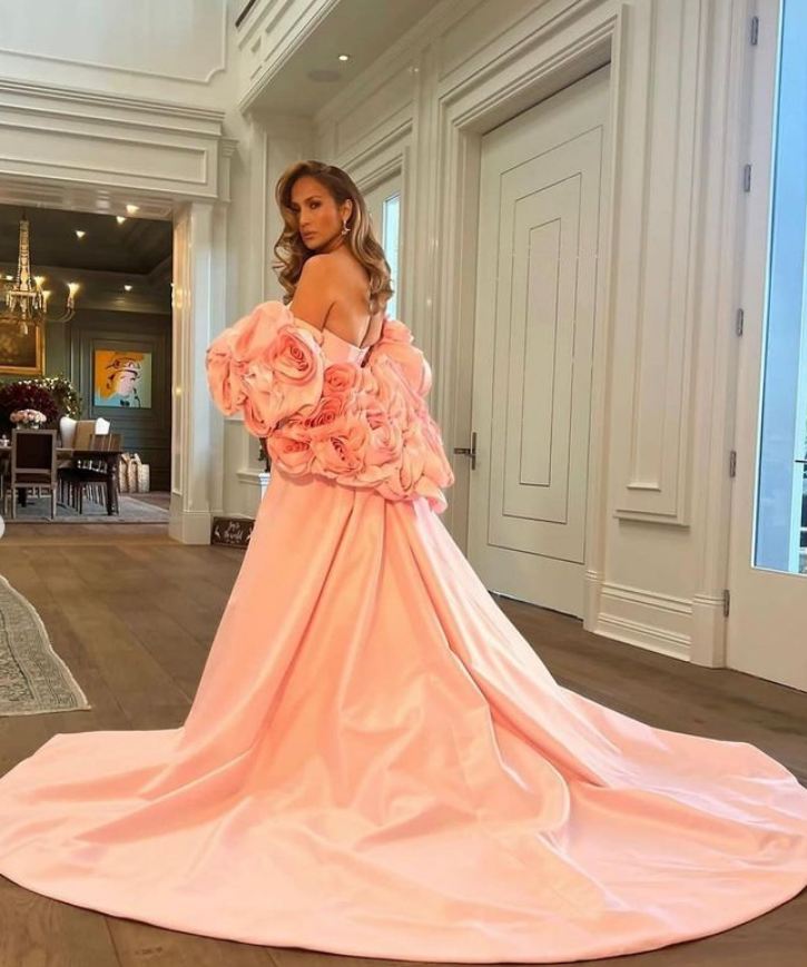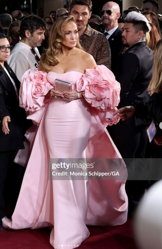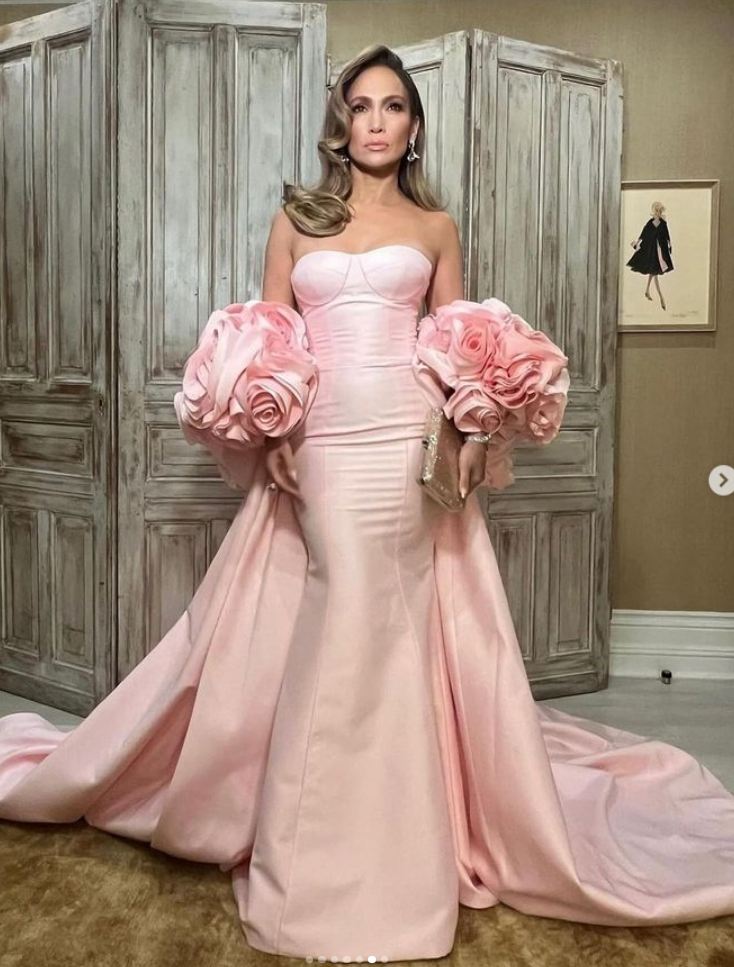وتألقت جينفر لوبيز بإطلالة ساحرة، من وحي الطبيعة الخلابة، حيث ارتدت فستان طويل مجسم، ينتمي لقصة الكب، مجسم، طويل، ونسقت عليه أكمام منسدلة صممت على هيئة الزهور الناعمة، صمم الفستان من قماش الكريب بلون الزهري حمل توقيع مصمم الأزياء اللبناني العالمي نيكول جبران مما عكس قوامها الرشيق وأنوثتها الطاغية دون تكلف.