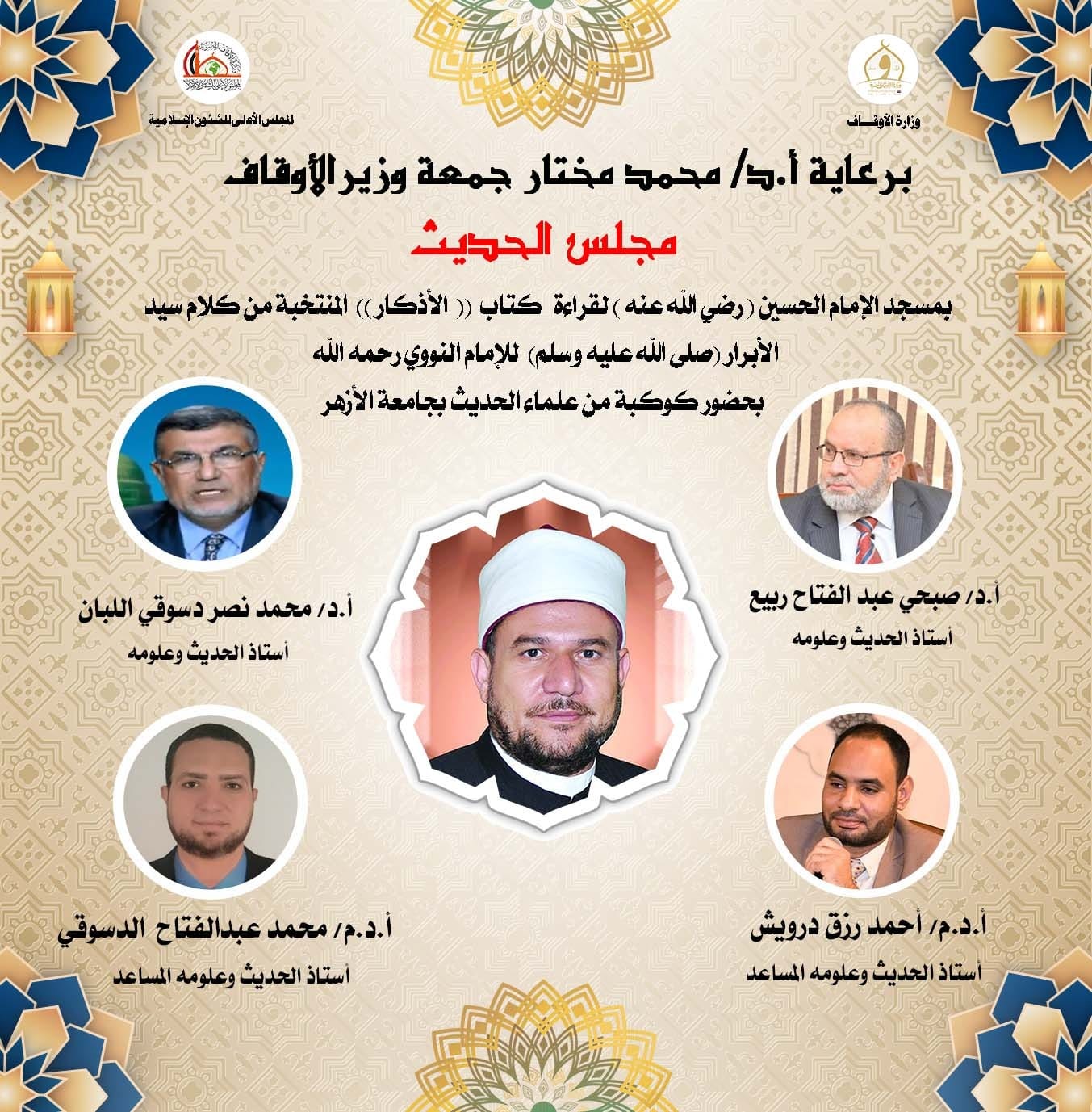 وسينعقد المجلس بمشيئة الله تعالى بمسجد الإمام الحسين (رضي الله عنه)، على يد كبار علماء الحديث الشريف بجامعة الأزهر، وهم:-