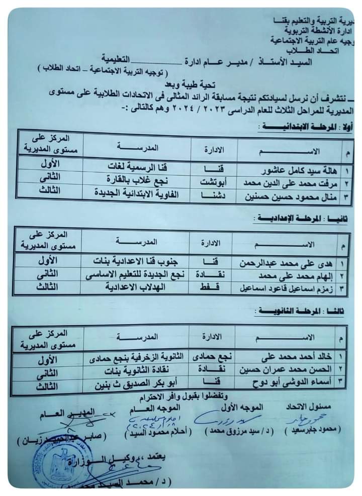 توجيه عام التربية الاجتماعية بمديرية التربية والتعليم بقنا، اليوم الثلاثاء، عن نتيجة أسماء الفائزين بالمراكز الثلاثة الأولى لمسابقة الرائد المثالي في الاتحادات الطلابية عن المراحل التعليمية الثلاثة.