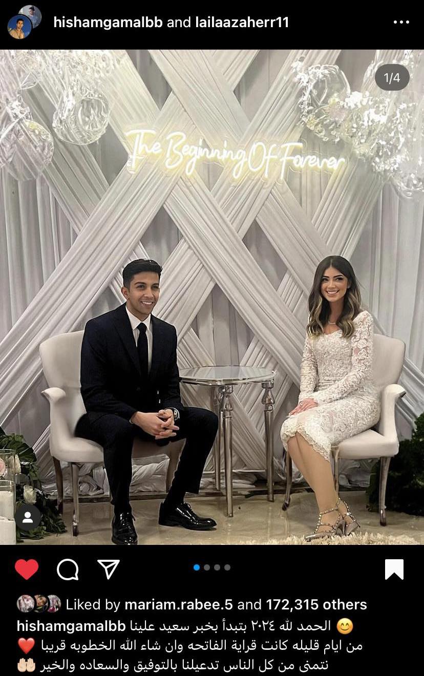 شارك هشام جمال الجمهور بمجموعة صور من قراءة فاتحته على ليلى زاهر وأرفقها بتعليق: "الحمد لله ٢٠٢٤ بتبدأ بخبر سعيد علينا .. من ايام قليله كانت قراية الفاتحه وان شاء الله الخطوبه قريبا .. نتمنى من كل الناس تدعيلنا بالتوفيق والسعاده والخير".