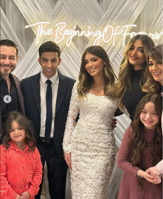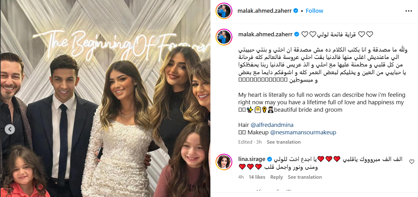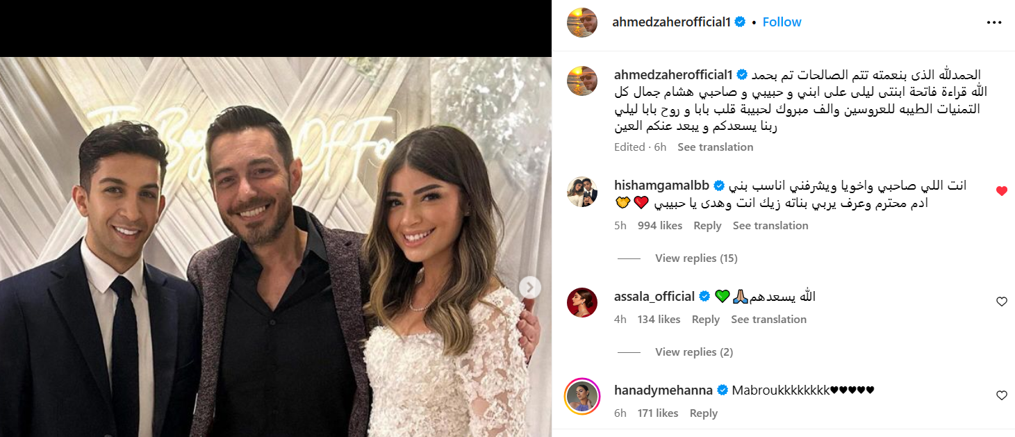 كما شارك والد العروس الفنان أحمد زاهر وشقيقتها ملك أحمد زاهر صور من الحفل مهنئين العروسين، داعين الله عز وجل أن يحميهم ويسعدهم ويديم الخير والمحبة بينهم ويبعد عنهم الحسد وأي سوء.