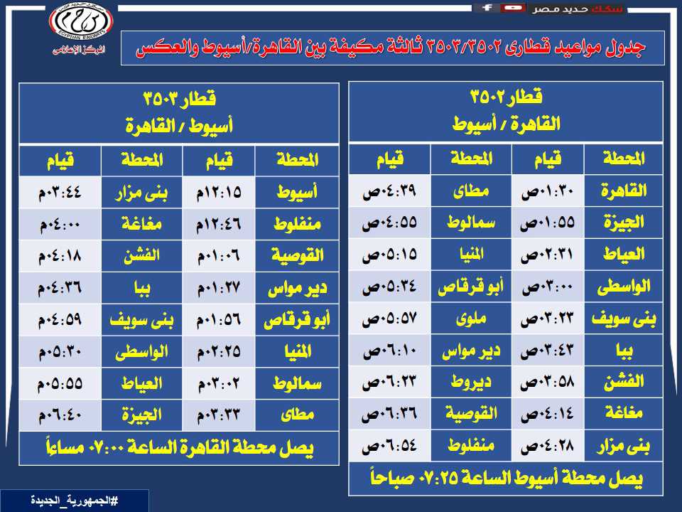 تقرر اعتبارًا من يوم السبت الموافق 13 / 1 / 2024 تشغيل قطار 3502 القاهرة / أسيوط بتركيب 8 عربات ثالثة مكيفة يقوم من محطة القاهرة الساعة 01:30 صباحًا ويصل محطة أسيوط الساعة 07:25 صباحًا، وتشغيل قطار 3503 أسيوط / القاهرة يقوم من محطة أسيوط الساعة 12:15 ظهراً ويصل محطة القاهرة الساعة 07:00 مساءً بنفس التركيب الوارد به قطار 3502 لمحطة أسيوط طبقًا للجداول المرفقة.