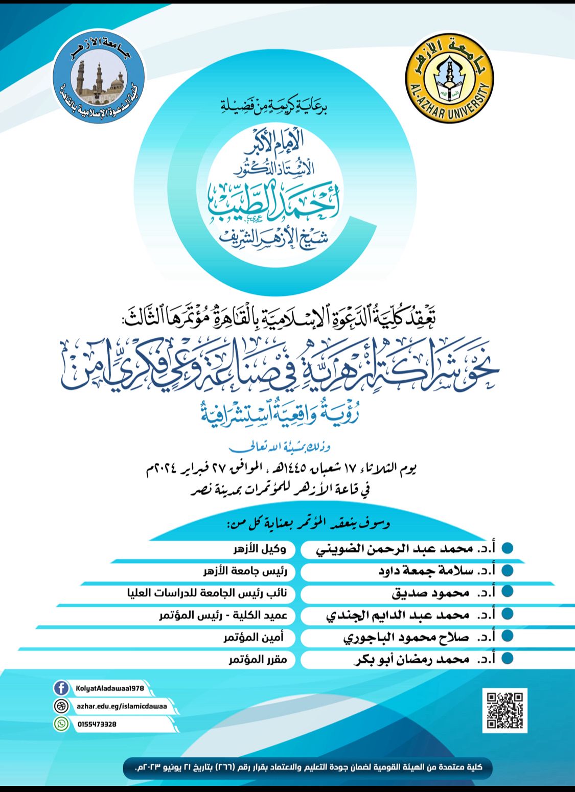تستعد كلية الدعوة الإسلامية بالقاهرة لعقد مؤتمرها الثالث في شهر فبراير المقبل برعاية الإمام الأكبر الدكتور أحمد الطيب، شيخ الأزهر الشريف، والدكتور سلامة داود، رئيس الجامعة، والدكتور محمود صديق، نائب رئيس الجامعة للدراسات العليا والبحوث.