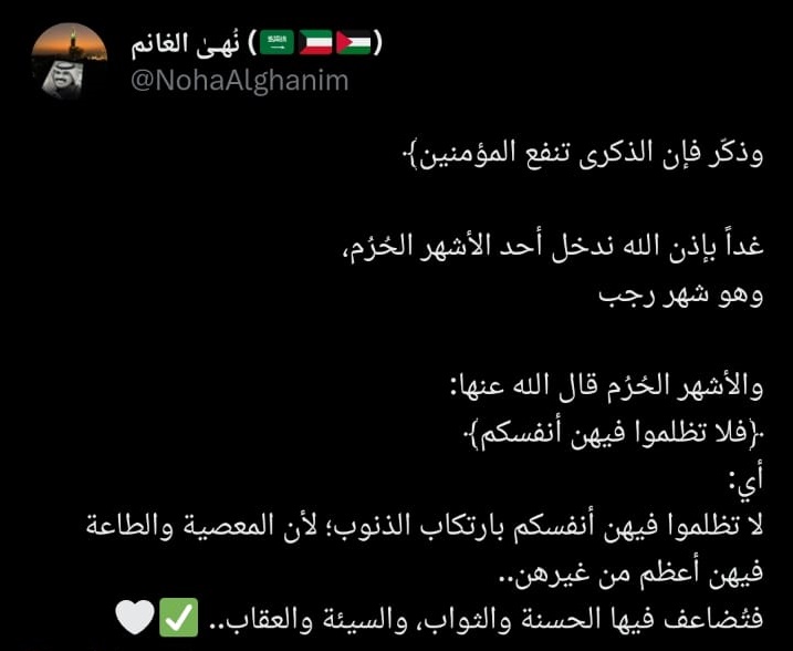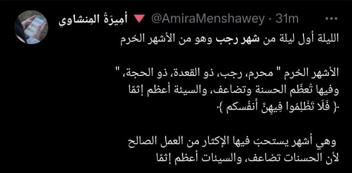 وقالت أحدى النشطاء:"بعد أذان مغرب اليوم.. كُل الموازين اختلفت، والأجور اختلفت!.. "فَلَا تَظْلِمُوا فِيهِنَّ أَنفُسَكُمْ". و"شهر رجب هو أحد مواسم زرع الخير، وتربية النفس وإعدادهاوأحد الأشهر الحُرم، التي عظم الله سبحانه فيها الحُرمات، وضاعف فيها أجر الحسنات، حتى أنه لتؤتى الحسنة فيه على أحسن أجرٍ وأكمله..فهو أوان تعظيم الحرمات..فلا تظلموا فيهن أنفسكم".