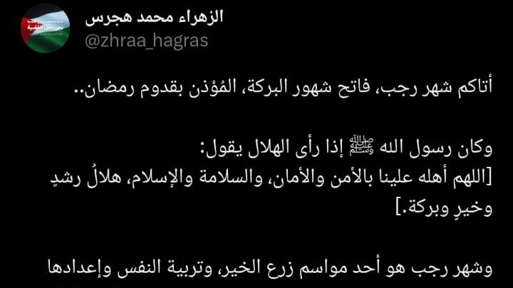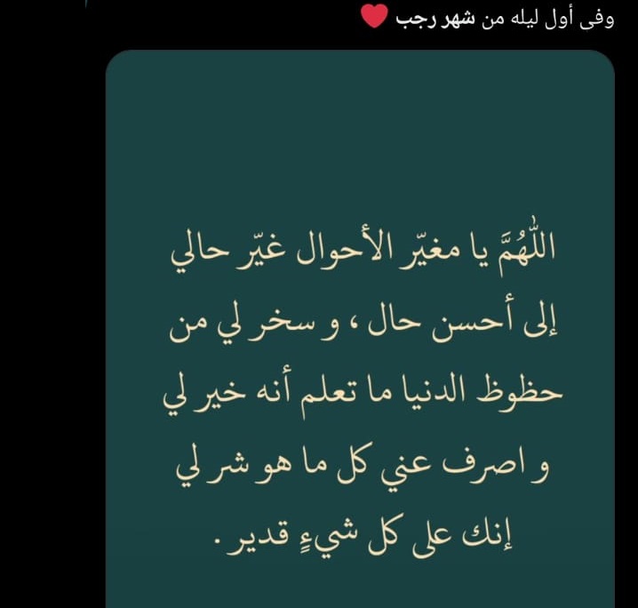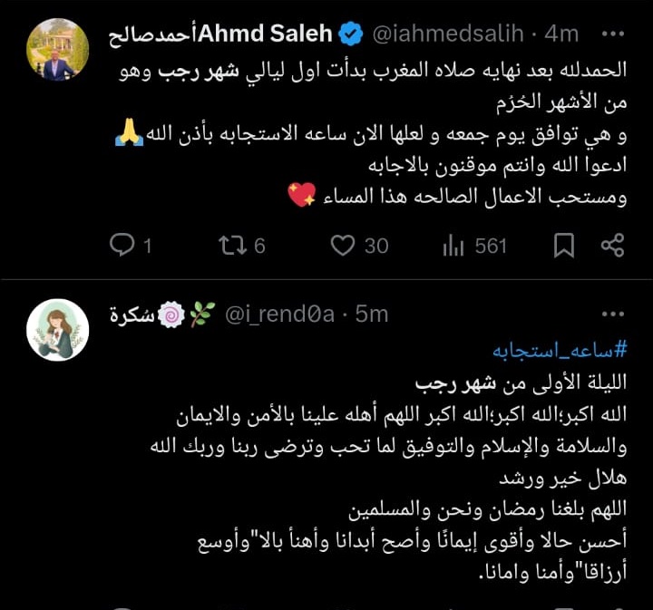 وكتبت أخر:" الليلة أول ليلة من شهر رجب وهو من الأشهر الحُرم " محرم، رجب، ذو القعدة، ذو الحجة"، وفيها تُعظّم الحسنة وتضاعف، والسيئة أعظم إثمًا"، وهي أشهر يستحبّ فيها الإكثار من العمل الصالح"، و"اللّهُمَّ بارِكْ لَنا فِي رَجَبٍ وَشَعْبانَ وَبَلِّغْنا شَهْرَ رَمَضانَ وَأَعِنَّا عَلى الصِيامِ وَالقِيامِ وَحِفْظِ اللّسانِ وَغَضِّ البَصَرِ وَلا تَجْعَلْ حَظَّنا مِنْهُ الجُوعَ وَالعَطَشَ".