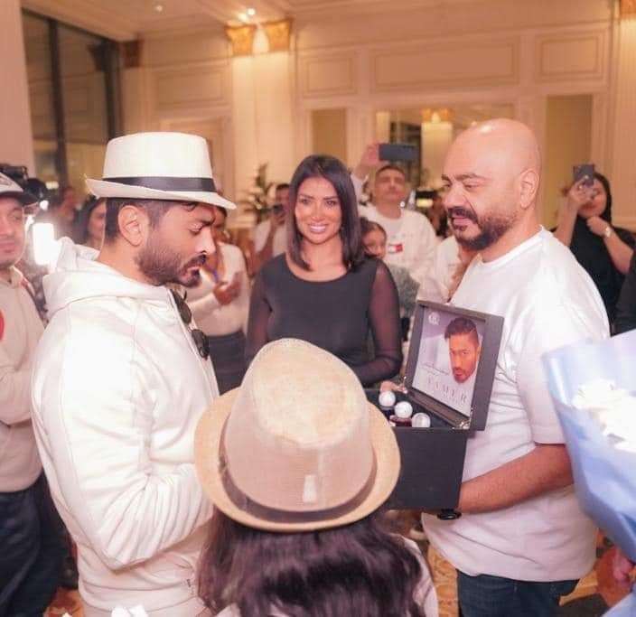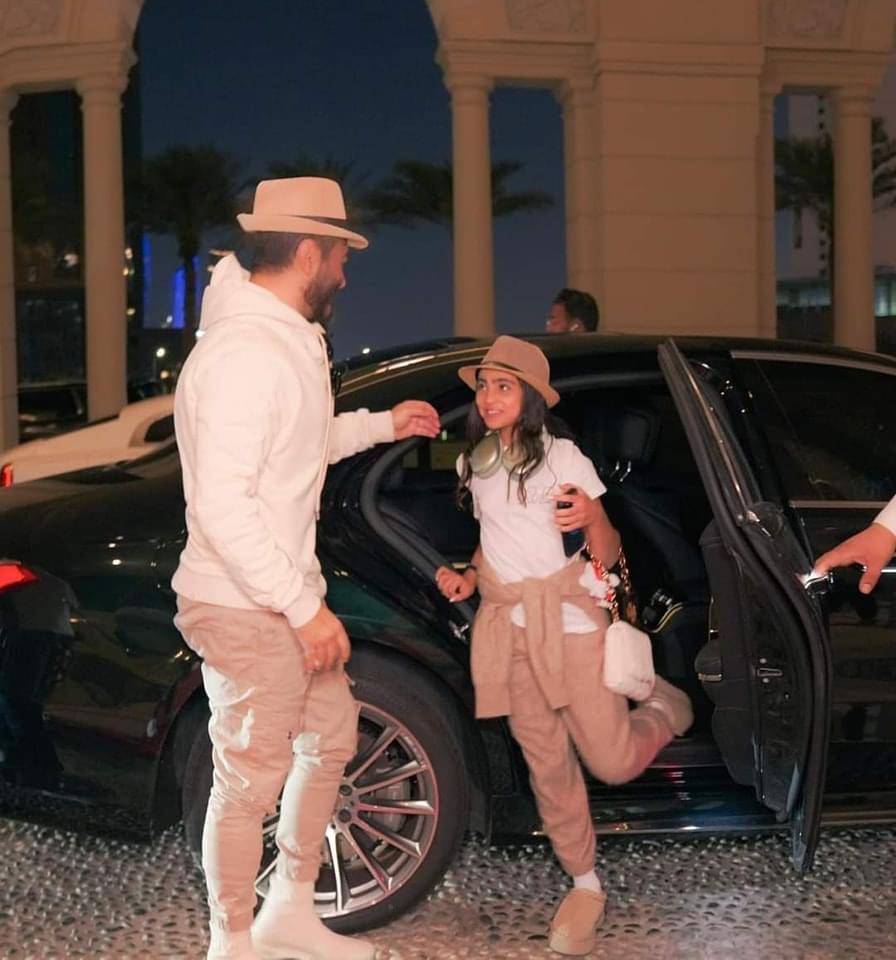 استقبال حافل بالورود لـ تامر حسني وابنته تاليا في دبي