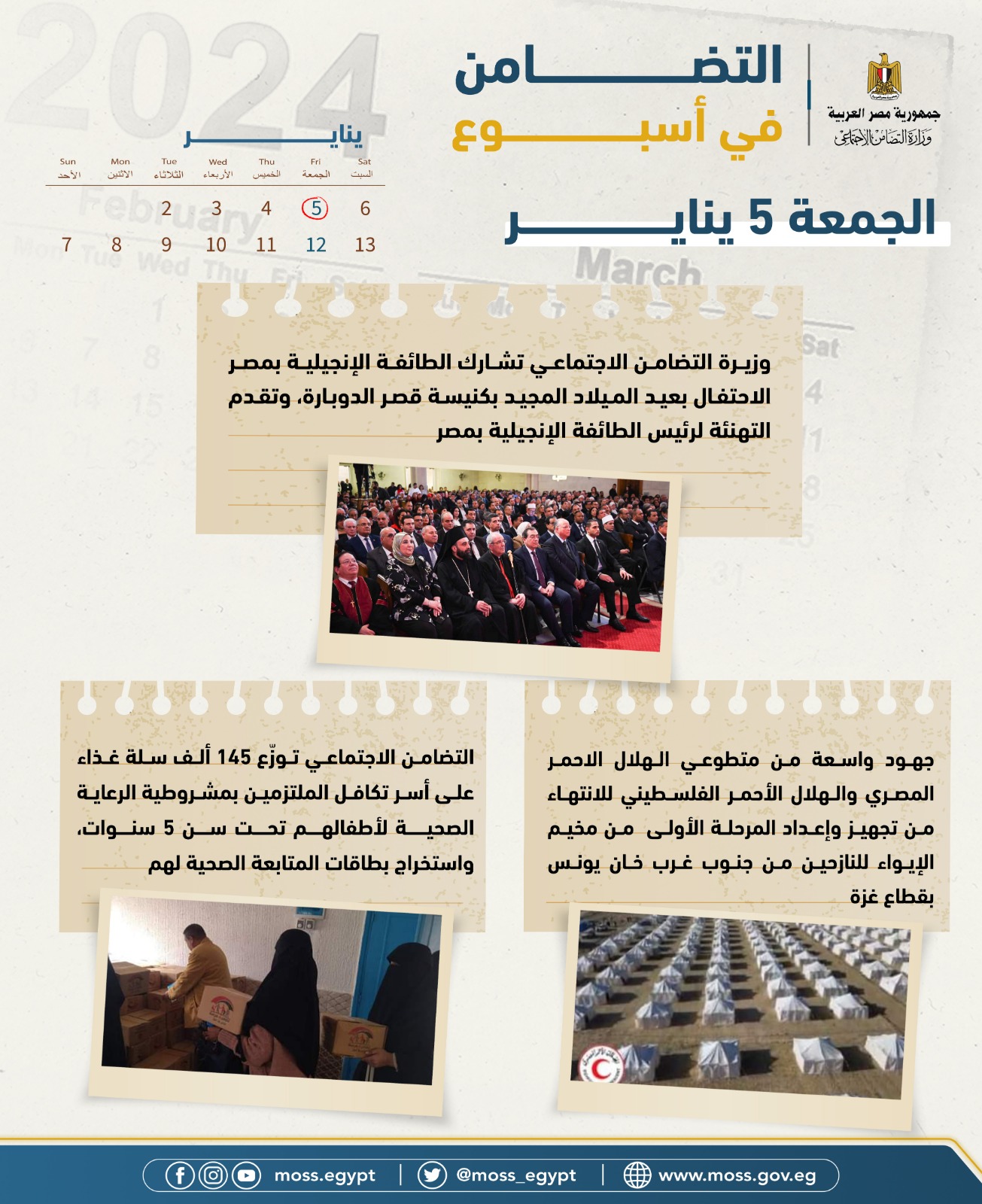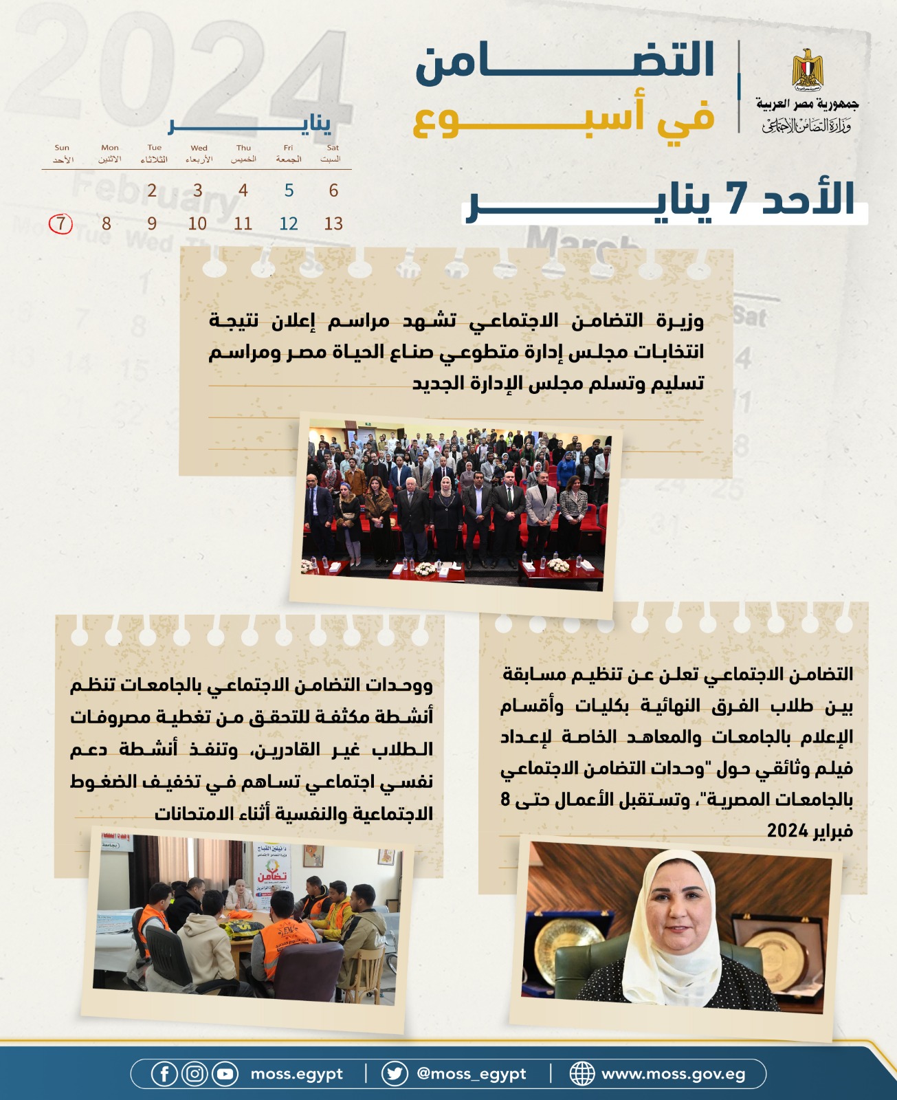 أصدرت وزارة التضامن الاجتماعي تقريرها الأسبوعي بالإنفوجراف والفيديو، حيث تستعرض من خلاله الأنشطة والأحداث، التي قامت بها السيدة نيفين القباج وزيرة التضامن الاجتماعي، وكذلك قطاعات الوزارة المختلفة خلال الفترة من 5 يناير إلى 11 يناير 2024 ونستعرض أبرزها في التقرير التالي: