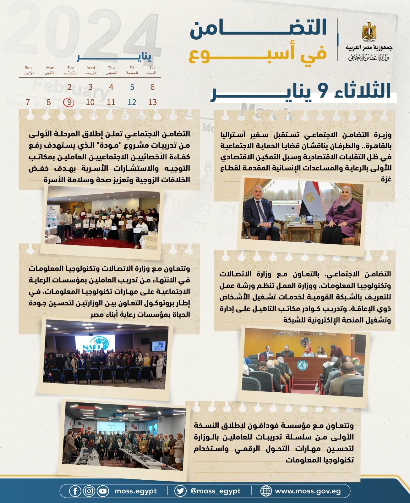 - التضامن الاجتماعي، بالتعاون مع وزارة الاتصالات وتكنولوجيا المعلومات، ووزارة العمل تنظم ورشة عمل للتعريف بالشبكة القومية لخدمات تشغيل الأشخاص ذوي الإعاقة، وتدريب كوادر مكاتب التاهيل على إدارة وتشغيل المنصة الإلكترونية للشبكة.